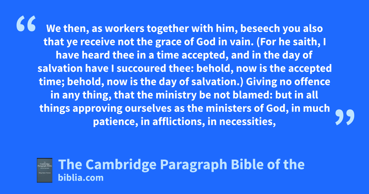VI. We then, as aworkers together with him, bbeseech you also cthat ye receive not the grace of God in vain. 2 (For he saith, dI have heard thee in a time accepted, and in the day of salvation have I succoured thee: ebehold, now is the faccepted time; behold, now is the day of salvation.) 3 gGiving no offence in any thing, hthat the ministry be not blamed: 4 but in all things * approving ourselves as ithe ministers of God, kin much patience, in afflictions, in lmnecessities, min distresses, 5 nin stripes, nin imprisonments, * in tumults, noin labours, oin watchings, oin pfastings; 6 by pureness, by knowledge, qby longsuffering, qby kindness, by the Holy Ghost, by rlove unfeigned, 7 by sthe word of truth, by tthe power of God, by uthe warmour of righteousness xon the right hand and on the left, 8 by honour and ydishonour, by evil report and good report: as zdeceivers, and yet true; 9 as unknown, and yet awell known; bas dying, and behold, we live; cas chastened, and not killed; 10 das sorrowful, yet alway rejoicing; eas poor, yet making many rich; as having nothing, and yet fpossessing all things.