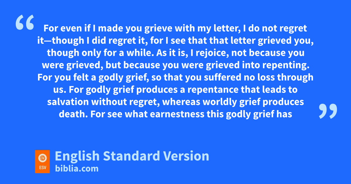 10 For xgodly grief produces a repentance that leads to salvation without regret, whereas yworldly grief produces death. 11 For see what earnestness this godly grief has produced in you, but also what eagerness to clear yourselves, what indignation, what fear, what longing, zwhat zeal, what punishment! At every point you have proved yourselves innocent in the matter. 12 So although I wrote to you, it was not for the sake of the one awho did the wrong, nor for the sake of the one who suffered the wrong, but in order that your earnestness for us might be revealed to you in the sight of God. 13 Therefore bwe are comforted.