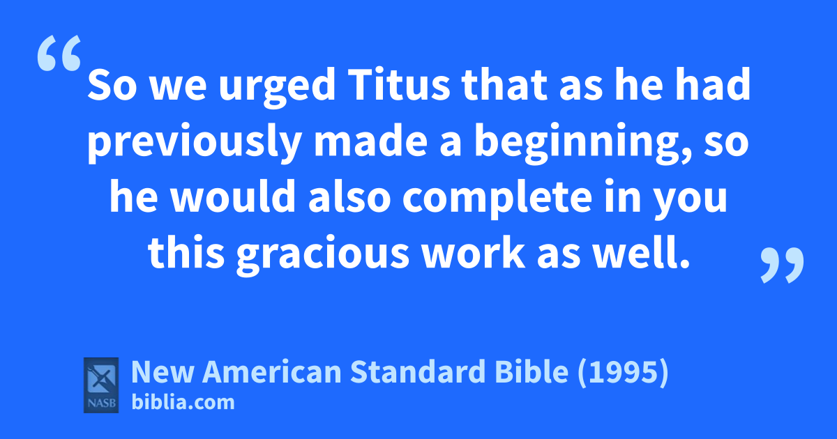 6 So we aurged bTitus that as he had previously cmade a beginning, so he would also complete in you dthis gracious work as well.