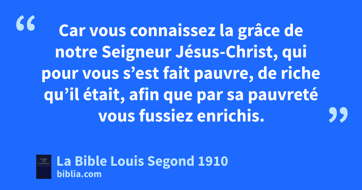 1Nous vous faisons connaître, frères, la grâce de Dieu qui s’est manifestée dans les Églises de la Macédoine. 2Au milieu de beaucoup de tribulations qui les ont éprouvées, leur joie débordante et leur pauvreté profonde ont produit avec abondance de riches libéralités de leur part. 3Ils ont, je l’atteste, donné volontairement selon leurs moyens, et même au delà de leurs moyens, 4anous demandant avec de grandes instances la grâce de prendre part à l’assistance destinée aux saints. 5Et non seulement ils ont contribué comme nous l’espérions, mais ils se sont d’abord donnés eux-mêmes au Seigneur, puis à nous, par la volonté de Dieu. 6Nous avons donc engagé Tite à achever chez vous cette oeuvre de bienfaisance, comme il l’avait commencée. 7De même que vous excellez en toutes choses, en foi, en parole, en connaissance, en zèle à tous égards, et dans votre amour pour nous, faites en sorte d’exceller aussi dans cette oeuvre de bienfaisance. 8Je ne dis pas cela pour donner un ordre, mais pour éprouver, par le zèle des autres, la sincérité de votre charité. 9Car vous connaissez la grâce de notre Seigneur Jésus-Christ, bqui pour vous s’est fait pauvre, de riche qu’il était, afin que par sa pauvreté vous fussiez enrichis. 10C’est un avis que je donne là-dessus, car cela vous convient, à vous qui non seulement avez commencé à agir, mais qui en avez eu la volonté dès l’année dernière. 11Achevez donc maintenant d’agir, afin que l’accomplissement selon vos moyens réponde à l’empressement que vous avez mis à vouloir. 12cLa bonne volonté, quand elle existe, dest agréable en raison de ce qu’elle peut avoir à sa disposition, et non de ce qu’elle n’a pas. 13Car il s’agit, non de vous exposer à la détresse pour soulager les autres, mais de suivre une règle d’égalité: dans la circonstance présente votre superflu pourvoira à leurs besoins, 14afin que leur superflu pourvoie pareillement aux vôtres, en sorte qu’il y ait égalité, 15selon qu’il est écrit: eCelui qui avait ramassé beaucoup n’avait rien de trop, et celui qui avait ramassé peu n’en manquait pas.