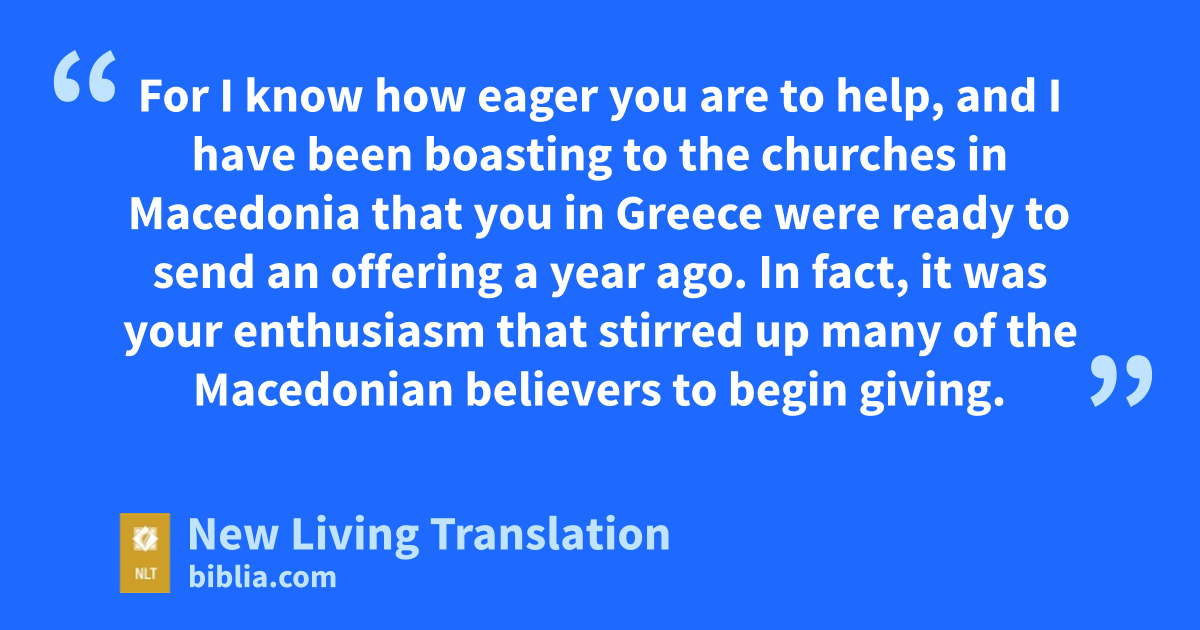 I really don’t need to write to you about this ministry of giving for the believers in Jerusalem.* 2 For I know how eager you are to help, and I have been boasting to the churches in Macedonia that you in Greece* were ready to send an offering a year ago. In fact, it was your enthusiasm that stirred up many of the Macedonian believers to begin giving.
