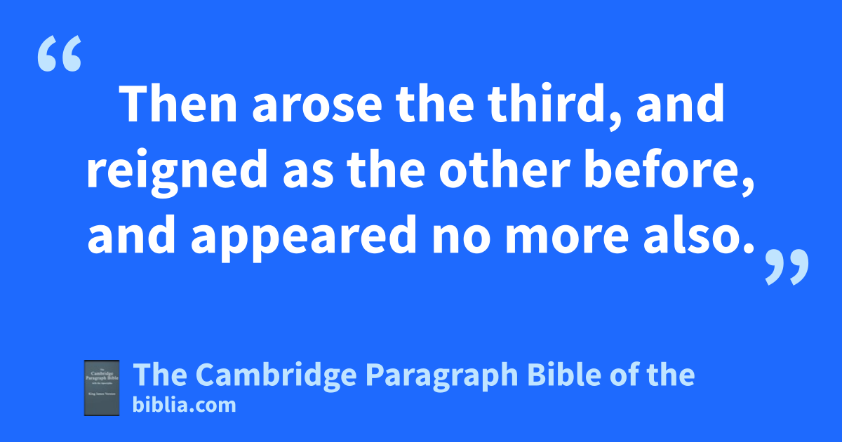 XI. Then saw I a dream, and behold, there came up afrom the sea aaan eagle, which had twelve feathered wings, and three heads. 2 And I saw, and behold, she spread her wings over all the earth, and all the winds of the air blew on her, and were gathered together. 3 And I beheld, and out of her feathers there grew other bcontrary feathers; and they became little feathers and small. 4 But her heads were at rest: the head in the midst was greater than the other, yet rested * it with the residue. 5 Moreover I beheld, and lo, the eagle flew with her feathers, and reigned upon earth, and over them that dwelt therein. 6 And I saw that all things under heaven were subject unto her, and no man spake against her, no, not one creature upon earth. 7 And I beheld, and lo, the eagle rose upon her talons, and spake to her feathers, saying, 8 Watch not all at once: sleep every one in his own place, and watch by course: 9 but let the heads be preserved for the last. 10 And I beheld, and lo, the voice went not out of her heads, but from the midst of her body. 11 And I numbered her bcontrary feathers, and behold, there were feight of them. 12 And I looked, and behold, con the right side there arose one feather, and reigned over all the earth; 13 and so it was, that when it reigned, the end of it came, and dthe place thereof appeared no more: so the next following stood up, and reigned, and had a great time; 14 and it happened, that when it reigned, the end of it came also, like as the first, so that it appeared no more. 15 Then came there a voice unto it, and said, 16 Hear thou that hast borne rule over the earth so long: this I say unto thee, before thou beginnest to appear no more, 17 There shall none after thee attain unto thy time, neither unto the half thereof. 18 Then arose the third, and reigned as the other before, and appeared no more also. 19 So went it with all the residue one after another, as that every one reigned, and then appeared no more. 20 Then I beheld, and lo, in process of time the feathers that followed stood up cupon the right side, that they might rule also; and some of them ruled, but within a while they appeared no more: 21 for some of them were set up, but ruled not. 22 After this I looked, and behold, ethe twelve feathers appeared no more, nor the ftwo blittle feathers: 23 and there was no more upon the eagle’s body, but three gheads that rested, and fsix blittle wings. 24 Then saw I also that two little feathers divided themselves from the six, and remained under the head that was upon the right side: for ithe four continued hin their place. 25 And I beheld, and lo, hthe feathers that were under the wing thought to set up themselves, and to have the rule. 26 And I beheld, and lo, there was ione set up, but shortly it appeared no more. 27 And ithe second was sooner away than the first. 28 And I beheld, and lo, ithe two that remained thought also in themselves to reign: 29 and when they so thought, behold, there awaked one of gthe heads that were at rest, namely, it that was in the midst; for that was greater than the two other heads. 30 And then I saw that the two other heads were joined with it. 31 And behold, the head was turned jwith them that were with it, and did eat up ithe two hfeathers under the wing that would have reigned. 32 But this head put the whole earth in fear, and bare rule in it over all those that dwelt upon the earth, kwith much oppression; and it had the governance of the world more than all the wings that had been. 33 And after this I beheld, and lo, the head that was in the midst suddenly appeared no more, llike as the wings. 34 But there remained the two heads, which also in like sort ruled upon the earth, and over those that dwelt therein. 35 And I beheld, and lo, the head upon the right side devoured it that was upon the left side.