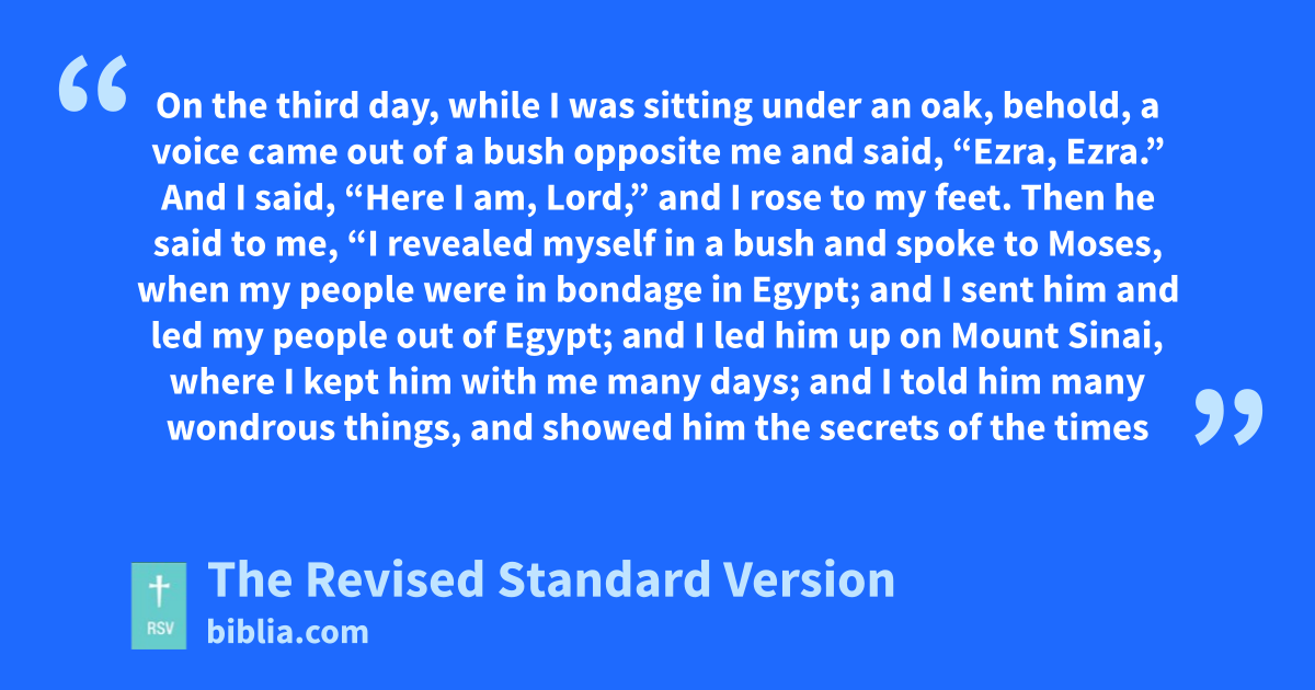 1 On the third day, while I was sitting under an oak, behold, a voice came out of a bush opposite me and said, “Ezra, Ezra.” 2 And I said, “Here I am, Lord,” and I rose to my feet. 3 Then he said to me, “I revealed myself in a bush and spoke to Moses, when my people were in bondage in Egypt; 4 and I sent him and led my people out of Egypt; and I led him up on Mount Sinai, where I kept him with me many days; 5 and I told him many wondrous things, and showed him the secrets of the times and declared to him the end of the times. Then I commanded him, saying, 6 ‘These words you shall publish openly, and these you shall keep secret.’ 7 And now I say to you; 8 Lay up in your heart the signs that I have shown you, the dreams that you have seen, and the interpretations that you have heard; 9 for you shall be taken up from among men, and henceforth you shall live with my Son and with those who are like you, until the times are ended. 10 For the age has lost its youth, and the times begin to grow old. 11 For the age is divided into twelve parts, and nine of its parts have already passed, 12 as well as half of the tenth part; so two of its parts remain, besides half of the tenth part. 13 Now therefore, set your house in order, and reprove your people; comfort the lowly among them, and instruct those that are wise. And now renounce the life that is corruptible, 14 and put away from you mortal thoughts; cast away from you the burdens of man, and divest yourself now of your weak nature, 15 and lay to one side the thoughts that are most grievous to you, and hasten to escape from these times. 16 For evils worse than those which you have now seen happen shall be done hereafter. 17 For the weaker the world becomes through old age, the more shall evils be multiplied among its inhabitants. 18 For truth shall go farther away, and falsehood shall come near. For the eagle which you saw in the vision is already hastening to come.”