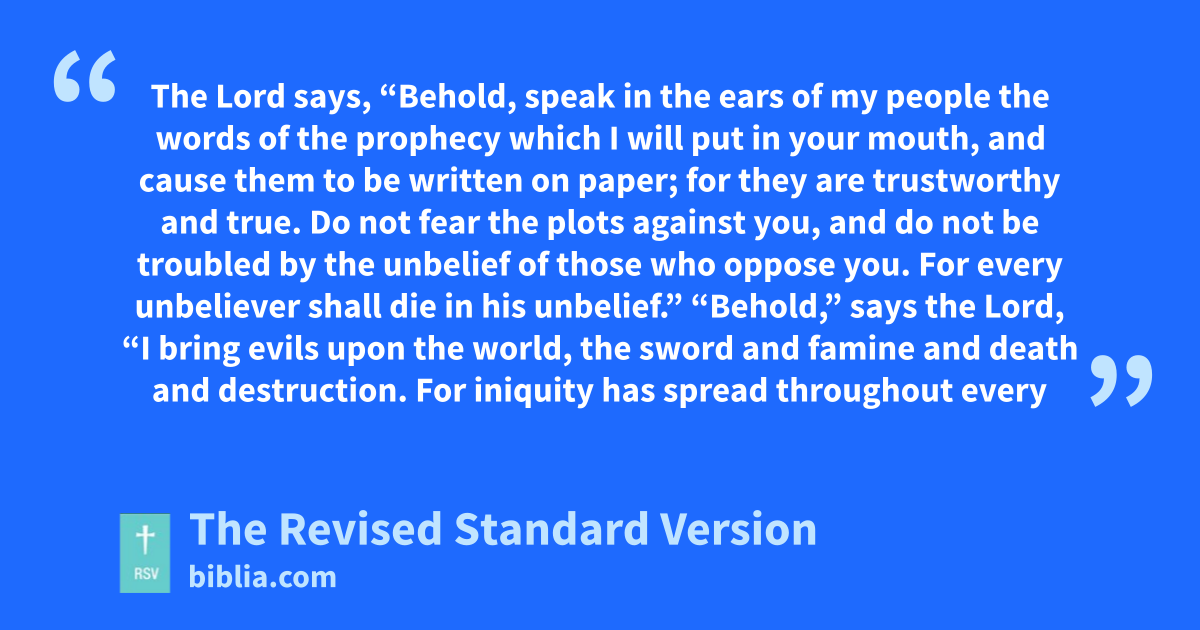 1 The Lord says, “Behold, speak in the ears of my people the words of the prophecy which I will put in your mouth, 2 and cause them to be written on paper; for they are trustworthy and true. 3 Do not fear the plots against you, and do not be troubled by the unbelief of those who oppose you. 4 For every unbeliever shall die in his unbelief.”