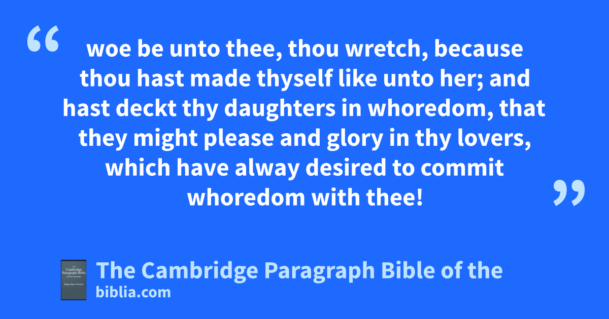 46 And thou, dAsia, that art * partaker of the hope of Babylon, and art the glory of her person: 47 woe be unto thee, thou wretch, because thou hast made thyself like unto her; and hast deckt thy daughters in whoredom, that they might please and glory in thy lovers, which have alway desired to commit whoredom with thee! 48 Thou hast followed her that is hated in all her works and inventions: therefore saith God, 49 eI will send plagues upon thee; widowhood, poverty, famine, sword, and pestilence, to waste thy houses with destruction and death. 50 And the glory of thy power fshall be dried up as a flower, when the heat shall arise that is sent over thee. 51 Thou shalt be weakened as a poor woman with stripes, and as one chastised with wounds, so that the mighty and lovers shall not be able to receive thee. 52 gWould I with jealousy have so proceeded against thee, saith the Lord, 53 if thou hadst not alway slain hmy chosen, exalting the stroke of thine hands, and saying over their * dead, iwhen thou wast drunken, 54 kSet forth the beauty of thy countenance? 55 The reward of thy whoredom shall be lin thy bosom, therefore shalt thou receive recompence. 56 Like as thou hast done unto hmy chosen, saith the Lord, even so shall God do unto thee, and shall deliver thee into mischief. 57 Thy children shall die of hunger, and thou shalt fall through the sword: thy cities shall be broken down, and all thine shall perish with the sword in the field. 58 They that be in the mountains shall die of hunger, and meat their own flesh, and drink their own blood, for very hunger of bread, and thirst of water. 59 Thou, as unhappy shalt come through the sea, and receive plagues again. 60 And in the passage they shall rush on the nidle city, and shall destroy some portion of thy land, and qconsume part of thy glory, and shall return to Babylon that was destroyed. 61 And thou shalt be cast down by them oas stubble, and they shall be unto thee as fire; 62 and shall consume thee, and thy cities, thy land, and thy mountains; all thy woods and thy fruitful trees shall they burn up with fire. 63 Thy children shall they carry away captive, and, look, pwhat thou hast, they shall spoil it, and * qmar the qbeauty of thy face.