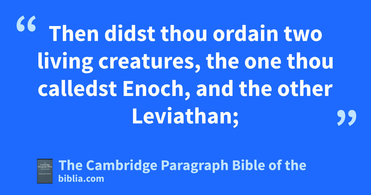 O Lord, thou spakest from the beginning of the creation, even the first day, and saidst thus; bLet heaven and earth be made; and thy word was a perfect work. 39 And cthen was the Spirit, and darkness and ccsilence were on every side; the sound of man’s voice was not yet formed. 40 dThen commandedst thou a fair light to come forth eof thy treasures, that thy work might appear. 41 fUpon the second day thou madest the spirit of the firmament, and commandedst it to part asunder and to make a division betwixt the waters, that the one part might go up, and the other remain beneath. 42 gUpon the third day thou didst command that the waters should be gathered in the seventh part of the earth: six parts hast thou dried up, and kept them, to the intent that of these some being planted of God and tilled might serve thee. 43 For as soon as thy word went forth the work was made. 44 For immediately there was hgreat and innumerable fruit, and many and divers pleasures for the taste, and iflowers of unchangeable colour, and odours of wonderful smell: and this was done the third day. 45 jUpon the fourth day thou commandedst that the sun should shine, and the moon give her light, and the stars should be in order: 46 and gavest them a charge to do kservice unto man, that was to be made. 47 lUpon the fifth day thou saidst unto mthe seventh part, where the waters were gathered, that it should bring forth living creatures, fowls and fishes: and so it came to pass. 48 lFor the dumb water and without life brought forth living things at the commandment of God, that all people might praise thy wondrous works. 49 Then didst thou ordain two living creatures, the one thou calledst * Enoch, and the other nLeviathan; 50 and didst separate the one from the other: for mthe seventh part (namely, where the water was gathered together) might not hold them both. 51 Unto oEnoch thou gavest mone part, which was dried up the third day, that he should dwell in the same part, wherein are pa thousand hills: 52 but unto Leviathan thou gavest mthe seventh part, namely, the moist; and qhast kept him to be devoured of whom thou wilt, and when. 53 rUpon the sixth day thou gavest commandment unto the earth, that before thee it should bring forth beasts, cattle, and creeping things: 54 sand after these, Adam also, whom thou madest lord of all thy creatures: of him come we all, and the people also whom thou hast chosen. 55 All this have I spoken before thee, O Lord, because tthou madest the world for our sakes. 56 As for the other people, which also come of Adam, thou hast said that they are nothing, but be like unto spittle: and hast likened the abundance of them unto a drop that falleth from a vessel. 57 And now, O Lord, behold, these heathen, which have ever been reputed as nothing, have begun to be lords over us, and to devour us. 58 But we thy people, (whom thou hast called uthy firstborn, thy only begotten, and thy fervent lover) are given into their hands. 59 If tthe world now be made for our sakes, why do we not possess an inheritance with the world? whow long shall this endure?