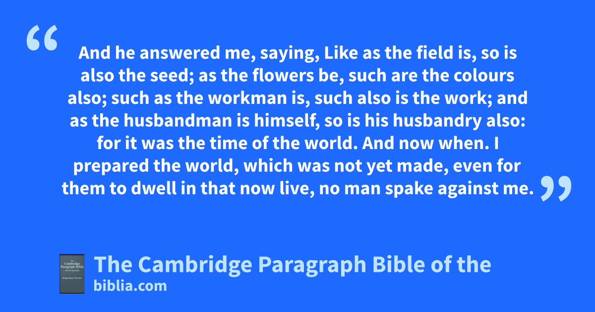 14 Then answered I and said, 15 I have said before, and now do speak, and will speak it also hereafter, that othere be many moe of them which perish, than of them which shall be saved, 16 like as a wave is greater than a drop. 17 And he answered me, saying, Like as the field is, so is also the seed; as the flowers be, such are the colours also; such as the workman is, such also is the work; and as the husbandman is himself, so is his husbandry also: * for it was the time of the world. 18 And now when. I prepared the world, which was not yet made, even for them to dwell in that now live, no man spake against me. 19 For then every one obeyed: * but now the manners of them which are created in this world that is made are corrupted by a perpetual seed, and by a law which is unsearchable rid themselves. 20 So I considered the world, and behold, there was peril because of the devices that were come into it. 21 And I saw, and sspared it greatly, and thave kept me a * grape of the cluster, and ta plant of a great people. 22 Let othe multitude perish then, which was born in vain; and let my * grape be kept, and my plant; for with great labour have I made it perfect. 23 Nevertheless, if thou wilt cease uyet seven days moe, (but thou shalt not fast in them, 24 but go into a field of flowers, where no house is builded, and weat only the flowers of the field; taste no flesh, drink no wine, but xeat flowers only;) 25 and pray unto the Highest continually, then will I come and talk with thee.