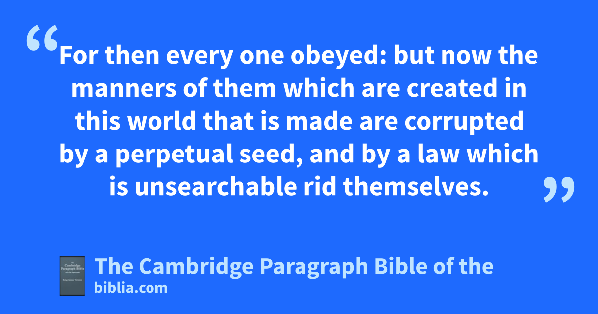 14 Then answered I and said, 15 I have said before, and now do speak, and will speak it also hereafter, that othere be many moe of them which perish, than of them which shall be saved, 16 like as a wave is greater than a drop. 17 And he answered me, saying, Like as the field is, so is also the seed; as the flowers be, such are the colours also; such as the workman is, such also is the work; and as the husbandman is himself, so is his husbandry also: * for it was the time of the world. 18 And now when. I prepared the world, which was not yet made, even for them to dwell in that now live, no man spake against me. 19 For then every one obeyed: * but now the manners of them which are created in this world that is made are corrupted by a perpetual seed, and by a law which is unsearchable rid themselves. 20 So I considered the world, and behold, there was peril because of the devices that were come into it. 21 And I saw, and sspared it greatly, and thave kept me a * grape of the cluster, and ta plant of a great people. 22 Let othe multitude perish then, which was born in vain; and let my * grape be kept, and my plant; for with great labour have I made it perfect. 23 Nevertheless, if thou wilt cease uyet seven days moe, (but thou shalt not fast in them, 24 but go into a field of flowers, where no house is builded, and weat only the flowers of the field; taste no flesh, drink no wine, but xeat flowers only;) 25 and pray unto the Highest continually, then will I come and talk with thee.