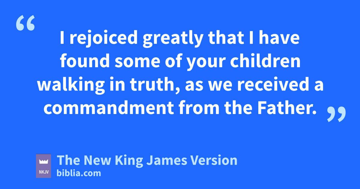 4 I crejoiced greatly that I have found some of your children walking in truth, as we received a commandment from the Father. 5 And now I plead with you, lady, not as though I wrote a new commandment to you, but that which we have had from the beginning: dthat we love one another. 6 eThis is love, that we walk according to His commandments. This is the commandment, that fas you have heard from the beginning, you should walk in it.