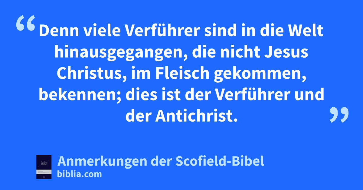 7 Denn viele Verführer sind in die Welt* hinausgegangen, die nicht Jesus Christus, im Fleischk gekommen, bekennen; dies ist der Verführer und der Antichrist* . 8 Seht auf euch selbst, damit ihr nicht verliert, was wir erarbeitet habenm, sondern vollen Lohn empfangt* ! 9 Jeder, der weitergehtb und nichtc in der Lehre des Christus bleibt, hat Gott nicht; wer in der Lehre bleibt, der hat sowohl den Vater als auch den Sohn. 10 Wenn jemand zu euch kommt und diese Lehre nicht bringtd, so nehmt ihn nicht ins Haus auf und grüßt ihn nicht* ! 11 Denn wer ihn grüßt, nimmt teil an seinen bösen Werken.