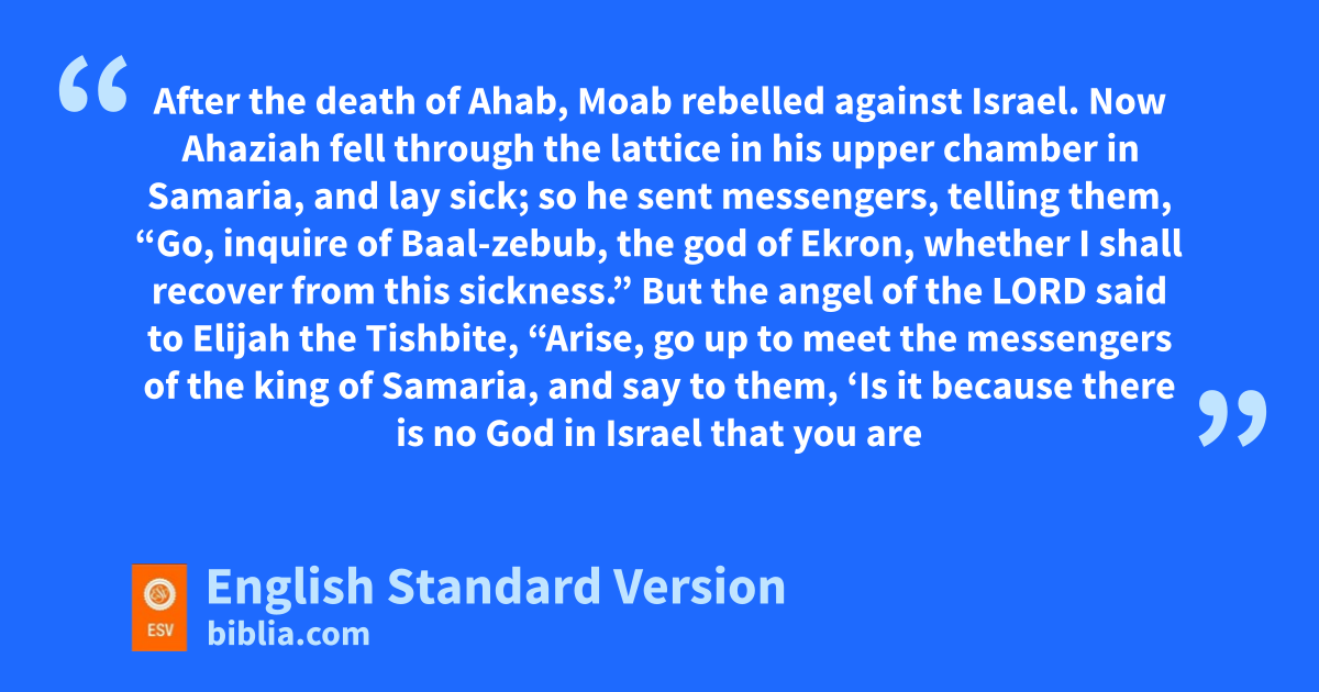 2 Now Ahaziah fell through the lattice in his upper chamber in Samaria, and lay sick; so he sent messengers, telling them, “Go, inquire of cBaal-zebub, the god of Ekron, dwhether I shall recover from this sickness.” 3 But the angel of the Lord said to Elijah ethe Tishbite, “Arise, go up to meet the messengers of the king of Samaria, and say to them, ‘Is it because there is no God in Israel that you are going to inquire of cBaal-zebub, the god of Ekron? 4 Now therefore thus says the Lord, fYou shall not come down from the bed to which you have gone up, but you shall surely die.’ ” So Elijah went.