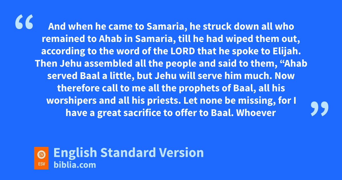 18 Then Jehu assembled all the people and said to them, c“Ahab served Baal a little, but Jehu will serve him much. 19 Now therefore call to me all the dprophets of Baal, all his worshipers and all his priests. Let none be missing, for I have a great sacrifice to offer to Baal. Whoever is missing shall not live.” But Jehu did it with cunning in order to destroy the worshipers of Baal. 20 And Jehu ordered, e“Sanctify fa solemn assembly for Baal.” So gthey proclaimed it. 21 And Jehu sent throughout all Israel, and all the worshipers of Baal came, so that there was not a man left who did not come. And they entered hthe house of Baal, and the house of Baal was filled from one end to the other. 22 He said to him who was in charge of the wardrobe, “Bring out the vestments for all the worshipers of Baal.” So he brought out the vestments for them. 23 Then Jehu went into the house of Baal with Jehonadab the son of Rechab, and he said to the worshipers of Baal, “Search, and see that there is no servant of the Lord here among you, but only the worshipers of Baal.” 24 Then they5 went in to offer sacrifices and burnt offerings.