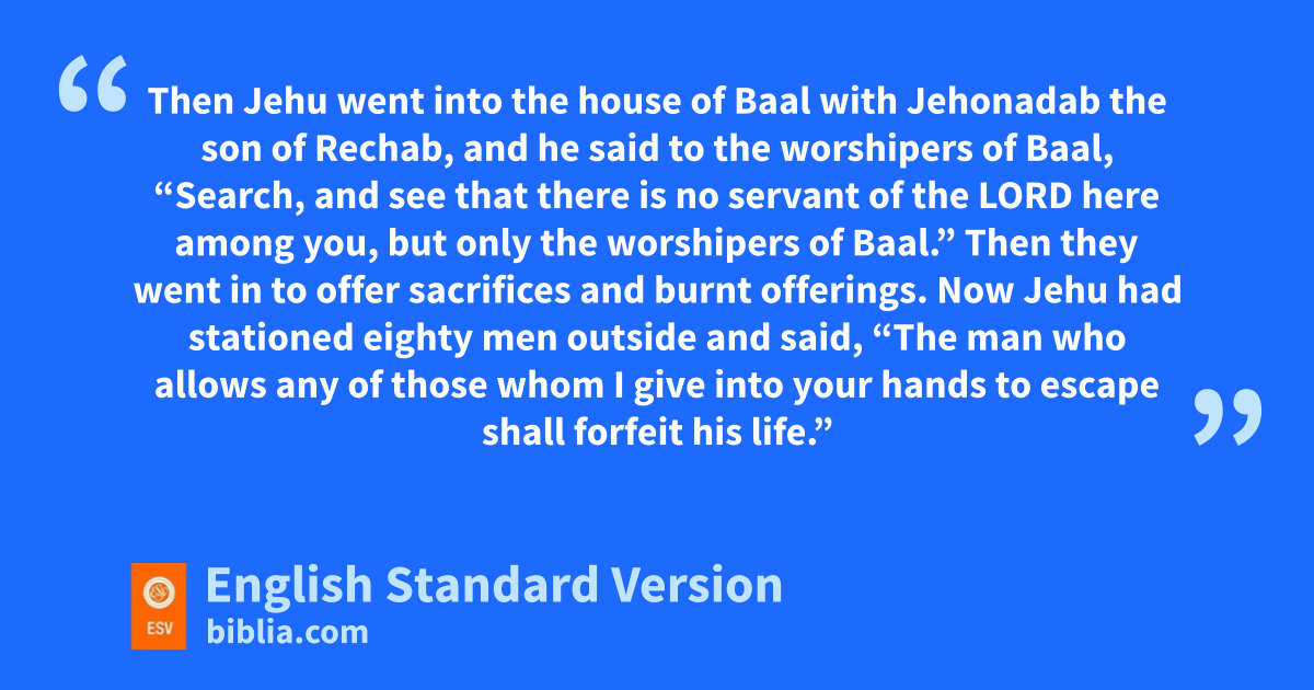 18 Then Jehu assembled all the people and said to them, c“Ahab served Baal a little, but Jehu will serve him much. 19 Now therefore call to me all the dprophets of Baal, all his worshipers and all his priests. Let none be missing, for I have a great sacrifice to offer to Baal. Whoever is missing shall not live.” But Jehu did it with cunning in order to destroy the worshipers of Baal. 20 And Jehu ordered, e“Sanctify fa solemn assembly for Baal.” So gthey proclaimed it. 21 And Jehu sent throughout all Israel, and all the worshipers of Baal came, so that there was not a man left who did not come. And they entered hthe house of Baal, and the house of Baal was filled from one end to the other. 22 He said to him who was in charge of the wardrobe, “Bring out the vestments for all the worshipers of Baal.” So he brought out the vestments for them. 23 Then Jehu went into the house of Baal with Jehonadab the son of Rechab, and he said to the worshipers of Baal, “Search, and see that there is no servant of the Lord here among you, but only the worshipers of Baal.” 24 Then they5 went in to offer sacrifices and burnt offerings.