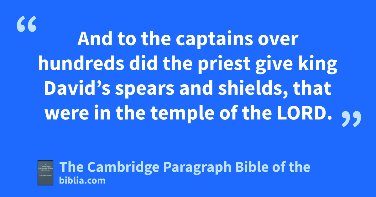 4 * And the seventh year cJehoiada sent and fet the rulers over hundreds, with the dcaptains and the eguard, and brought them to him into the house of the Lord, and made a covenant with them, and took an oath of them in the house of the Lord, and shewed them the king’s son. 5 And he commanded them, saying, This is the thing that ye shall do; A third part of you fthat enter in on the sabbath shall even be keepers of the watch of the king’s house; 6 and a third part shall be at the gate of gSur; and a third part at the gate behind the eguard: so shall ye keep the watch of the house, * that it be not broken down. 7 And two * parts of all you fthat go forth on the sabbath, even they shall keep the watch of the house of the Lord about the king. 8 And ye shall hcompass the king round about, every man with his weapons in his hand: and he that cometh within ithe ranges, let him be slain: and be ye with the king as jhe goeth out and as he cometh in. 9 And the captains over the hundreds did according to all things that Jehoiada the priest commanded: and they took every man his men fthat were to come in on the sabbath, with them that should go out on the sabbath, and came to Jehoiada the priest. 10 And to the captains over hundreds did the priest give king David’s spears and kshields, that were in the temple of the Lord. 11 And the eguard stood, every man with his weapons in his hand, round about the king, from the right * corner of the temple to the left corner of the temple, along by the altar and the temple. 12 And he brought forth the king’s son, and put lthe crown upon him, and gave him mthe Testimony; and they made him king, and anointed him; and they clapt their hands, and said, * God save the king.