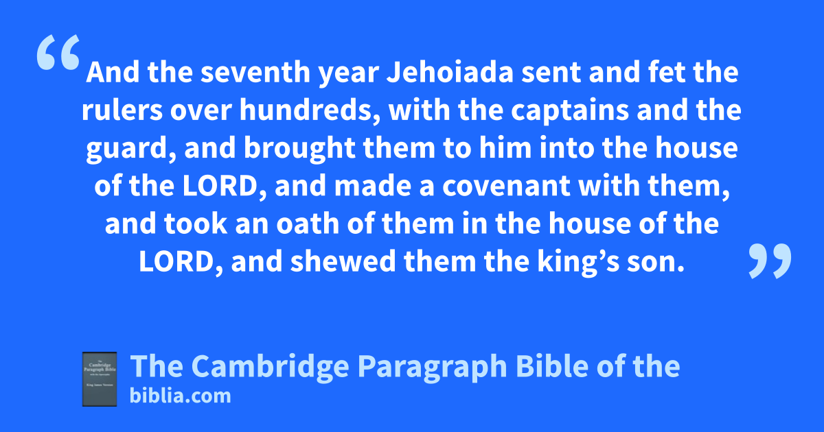 4 * And the seventh year cJehoiada sent and fet the rulers over hundreds, with the dcaptains and the eguard, and brought them to him into the house of the Lord, and made a covenant with them, and took an oath of them in the house of the Lord, and shewed them the king’s son. 5 And he commanded them, saying, This is the thing that ye shall do; A third part of you fthat enter in on the sabbath shall even be keepers of the watch of the king’s house; 6 and a third part shall be at the gate of gSur; and a third part at the gate behind the eguard: so shall ye keep the watch of the house, * that it be not broken down. 7 And two * parts of all you fthat go forth on the sabbath, even they shall keep the watch of the house of the Lord about the king. 8 And ye shall hcompass the king round about, every man with his weapons in his hand: and he that cometh within ithe ranges, let him be slain: and be ye with the king as jhe goeth out and as he cometh in. 9 And the captains over the hundreds did according to all things that Jehoiada the priest commanded: and they took every man his men fthat were to come in on the sabbath, with them that should go out on the sabbath, and came to Jehoiada the priest. 10 And to the captains over hundreds did the priest give king David’s spears and kshields, that were in the temple of the Lord. 11 And the eguard stood, every man with his weapons in his hand, round about the king, from the right * corner of the temple to the left corner of the temple, along by the altar and the temple. 12 And he brought forth the king’s son, and put lthe crown upon him, and gave him mthe Testimony; and they made him king, and anointed him; and they clapt their hands, and said, * God save the king.