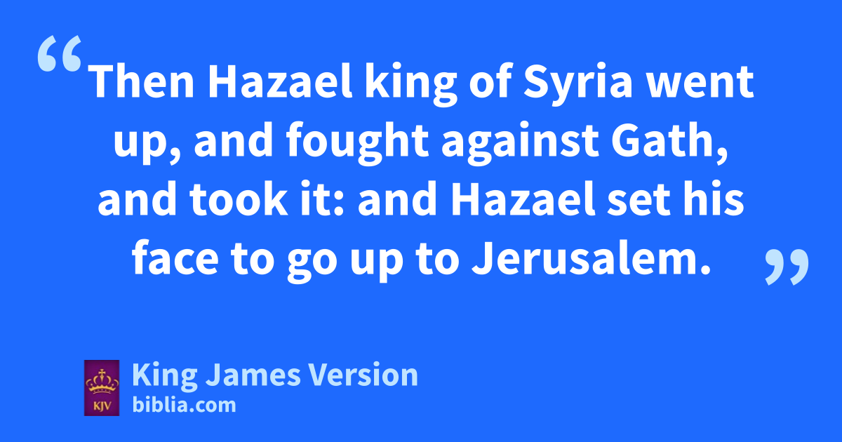 17 *Then uHazael king of Syria went up, and fought against xGath, and took it: and Hazael yset his face to go up to Jerusalem. 18 And Jehoash king of Judah ztook all the hallowed things that Jehoshaphat, and Jehoram, and Ahaziah, his fathers, kings of Judah, had dedicated, and ahis own hallowed things, and all the gold that was found in the treasures of the house of the Lord, and in the king’s house, and sent it to Hazael king of Syria: and bhe †went away from Jerusalem. 19 And the rest of the acts of Joash, and all that he did, are they not written in the book of the chronicles of the kings of Judah? 20 *And chis servants arose, and made a conspiracy, and slew Joash in ||the house of Millo, which goeth down to dSilla. 21 For ||Jozachar the son of Shimeath, and Jehozabad the son of ||Shomer, his servants, smote him, and he died; and they buried him with his fathers in the city of David: and Amaziah his son reigned in his stead.
