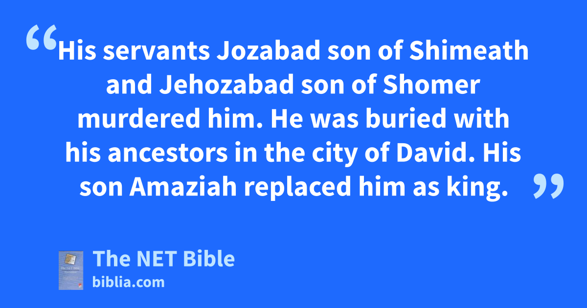 12:19 The rest of the events of Joash’s reign, including all his accomplishments, are recorded in the scroll called the Annals of the Kings of Judah.25 12:20 His servants conspired against him26 and murdered Joash at Beth-Millo, on the road that goes down to Silla.27 12:21 His servants Jozabad son of Shimeath and Jehozabad son of Shomer murdered him.28 He was buried29 with his ancestors in the city of David. His son Amaziah replaced him as king.