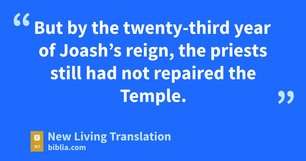 6 But by the twenty-third year of Joash’s reign, the priests still had not repaired the Temple. 7 So King Joash called for Jehoiada and the other priests and asked them, “Why haven’t you repaired the Temple? Don’t use any more money for your own needs. From now on, it must all be spent on Temple repairs.” 8 So the priests agreed not to accept any more money from the people, and they also agreed to let others take responsibility for repairing the Temple.
