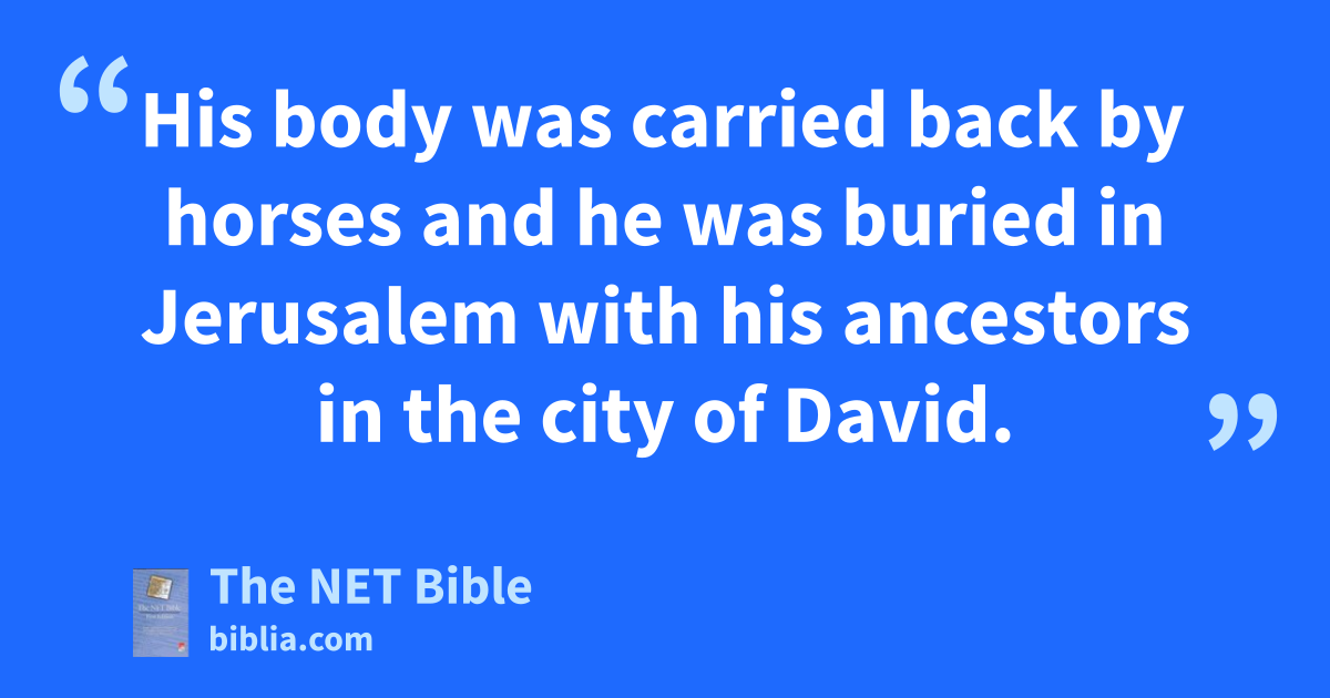 14:17 King Amaziah son of Joash of Judah lived for fifteen years after the death of King Jehoash son of Jehoahaz of Israel. 14:18 The rest of the events of Amaziah’s reign are recorded in the scroll called the Annals of the Kings of Judah.33 14:19 Conspirators plotted against him in Jerusalem,34 so he fled to Lachish. But they sent assassins after him35 and they killed him there. 14:20 His body was carried back by horses36 and he was buried in Jerusalem with his ancestors in the city of David. 14:21 All the people of Judah took Azariah, who was sixteen years old, and made him king in his father Amaziah’s place. 14:22 Azariah37 built up Elat and restored it to Judah after the king38 had passed away.39