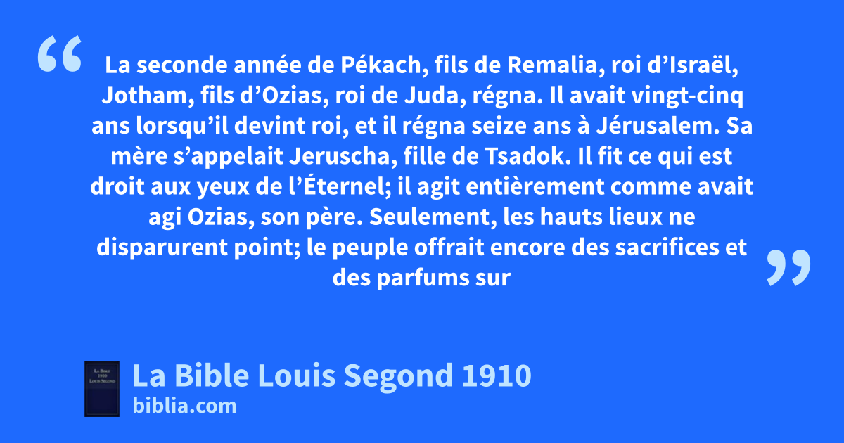 32La seconde année de Pékach, fils de Remalia, roi d’Israël, gJotham, fils d’Ozias, roi de Juda, régna. 33hIl avait vingt-cinq ans lorsqu’il devint roi, et il régna seize ans à Jérusalem. Sa mère s’appelait Jeruscha, fille de Tsadok. 34Il fit ce qui est droit aux yeux de l’Éternel; il agit entièrement comme avait agi Ozias, son père. 35Seulement, les hauts lieux ne disparurent point; le peuple offrait encore des sacrifices et des parfums sur les hauts lieux. Jotham bâtit la porte supérieure de la maison de l’Éternel. 36Le reste des actions de Jotham, et tout ce qu’il a fait, cela n’est-il pas écrit dans le livre des Chroniques des rois de Juda? 37Dans ce temps-là, l’Éternel commença à ienvoyer contre Juda Retsin, roi de Syrie, et Pékach, fils de Remalia. 38Jotham se coucha avec ses pères, et il fut enterré avec ses pères dans la ville de David, son père. Et Achaz, son fils, régna à sa place.