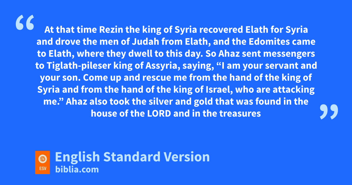 5 dThen Rezin king of Syria and dPekah the son of Remaliah, king of Israel, came up to wage war on Jerusalem, and they besieged Ahaz ebut could not conquer him. 6 At that time Rezin the king of Syria recovered fElath for Syria and drove the men of Judah from fElath, and the Edomites came to Elath, where they dwell to this day. 7 gSo Ahaz sent messengers to hTiglath-pileser king of Assyria, saying, “I am your servant and your son. Come up and rescue me from the hand of the king of Syria and from the hand of the king of Israel, who are attacking me.” 8 Ahaz also itook the silver and gold that was found in the house of the Lord and in the treasures of the king’s house and sent a present to the king of Assyria. 9 jAnd the king of Assyria listened to him. The king of Assyria marched up against Damascus kand took it, carrying its people captive to lKir, and he killed Rezin.