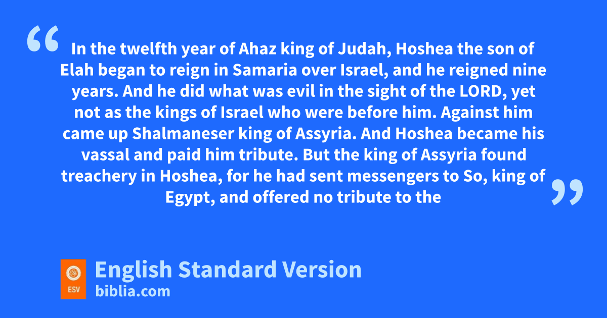 17 In the twelfth year of Ahaz king of Judah, xHoshea the son of Elah began to reign in Samaria over Israel, and he reigned nine years. 2 And he did what was evil in the sight of the Lord, yet not as the kings of Israel who were before him. 3 yAgainst him came up zShalmaneser king of Assyria. And Hoshea became his vassal and paid him tribute. 4 But the king of Assyria found treachery in Hoshea, for he had sent messengers to So, king of Egypt, and offered no tribute to the king of Assyria, as he had done year by year. Therefore the king of Assyria shut him up and bound him in prison. 5 Then the king of Assyria invaded all the land and came to Samaria, and for three years he besieged it.