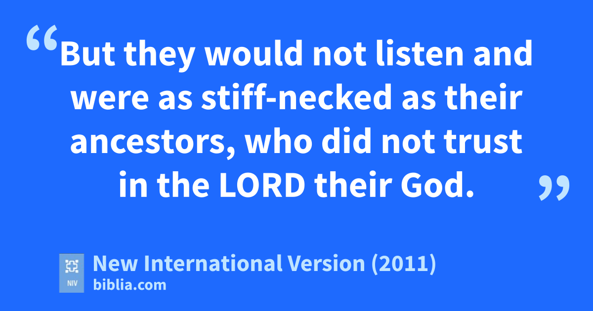 14 But they would not listen and were as stiff-neckedc as their ancestors, who did not trust in the Lord their God. 15 They rejected his decrees and the covenantd he had made with their ancestors and the statutes he had warned them to keep. They followed worthless idolse and themselves became worthless.f They imitated the nationsg around them although the Lord had ordered them, “Do not do as they do.”