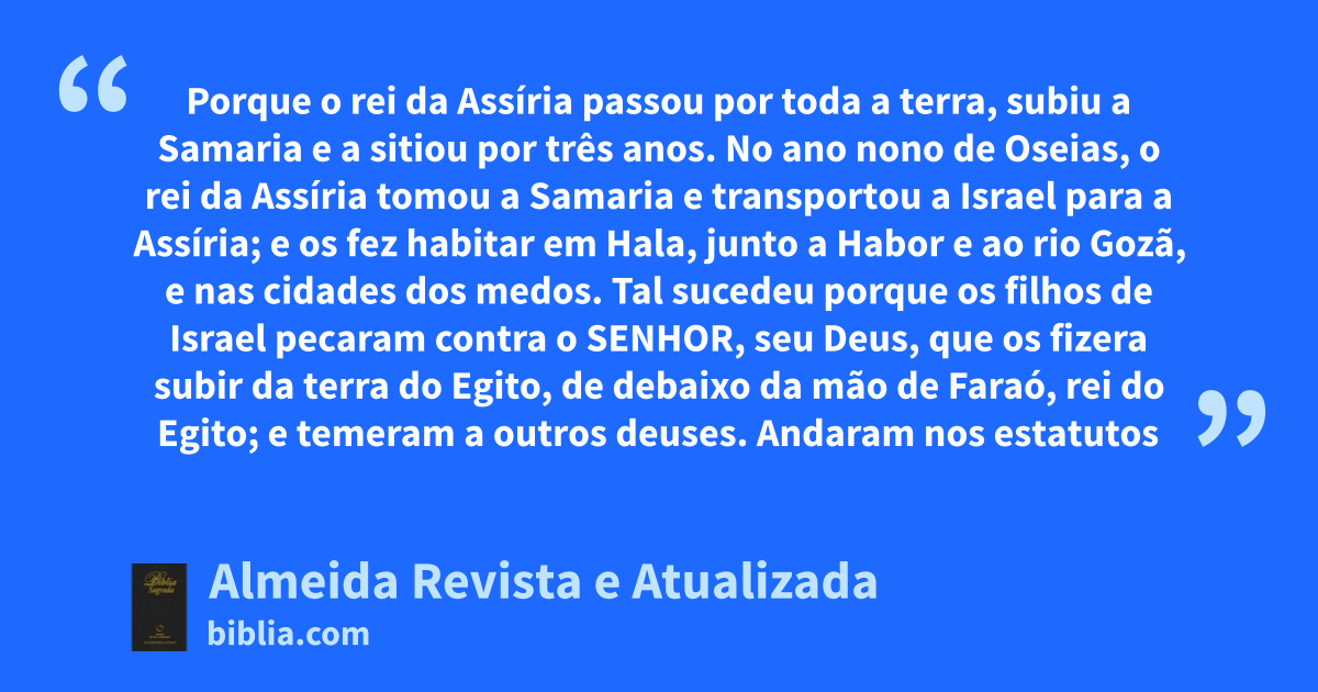 3 Contra ele subiu Salmaneser, rei da Assíria; Oseias ficou sendo servo dele e lhe pagava tributo. 4 Porém o rei da Assíria achou Oseias em conspiração, porque enviara mensageiros a Sô, rei do Egito, e não pagava tributo ao rei da Assíria, como dantes fazia de ano em ano; por isso, o rei da Assíria o encerrou em grilhões, num cárcere. 5 Porque o rei da Assíria passou por toda a terra, subiu a Samaria e a sitiou por três anos. 6 No ano nono de Oseias, o rei da Assíria tomou a Samaria e transportou a Israel para a Assíria; e os fez habitar em Hala, junto a Habor e ao rio Gozã, e nas cidades dos medos.