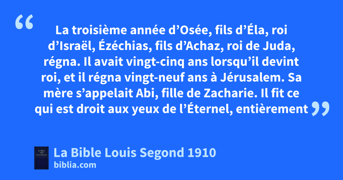 1La troisième année d’Osée, fils d’Éla, roi d’Israël, aÉzéchias, fils d’Achaz, roi de Juda, régna. 2Il avait vingt-cinq ans lorsqu’il devint roi, et il régna vingt-neuf ans à Jérusalem. Sa mère s’appelait Abi, fille de Zacharie. 3Il fit ce qui est droit aux yeux de l’Éternel, entièrement comme avait fait David, son père. 4bIl fit disparaître les hauts lieux, brisa les statues, abattit les idoles, et mit en pièces le serpent d’airain que Moïse avait fait, car les enfants d’Israël avaient jusqu’alors brûlé des parfums devant lui: on l’appelait Nehuschtan. 5Il mit sa confiance en l’Éternel, le Dieu d’Israël; et parmi tous les rois de Juda qui vinrent après lui ou qui le précédèrent, il n’y en eut point de semblable à lui. 6Il fut attaché à l’Éternel, il ne se détourna point de lui, et il observa les commandements que l’Éternel avait prescrits à Moïse. 7Et l’Éternel fut avec Ézéchias, qui réussit dans toutes ses entreprises. Il se révolta contre le roi d’Assyrie, et ne lui fut plus assujetti. 8cIl battit les Philistins jusqu’à Gaza, et ravagea leur territoire depuis les tours des gardes jusqu’aux villes fortes.