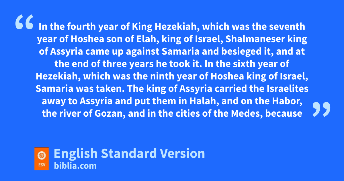 9 In the fourth year of King Hezekiah, which was the seventh year of Hoshea son of Elah, king of Israel, xShalmaneser king of Assyria came up against Samaria and besieged it, 10 and at the end of three years he took it. In the sixth year of Hezekiah, which was the ninth year of Hoshea king of Israel, Samaria was taken. 11 The king of Assyria carried the Israelites away to Assyria and put them in yHalah, and on the yHabor, ythe river of Gozan, and in the cities of the Medes, 12 because they did not obey the voice of the Lord their God but transgressed his covenant, even all that Moses the servant of the Lord commanded. They neither listened nor obeyed.