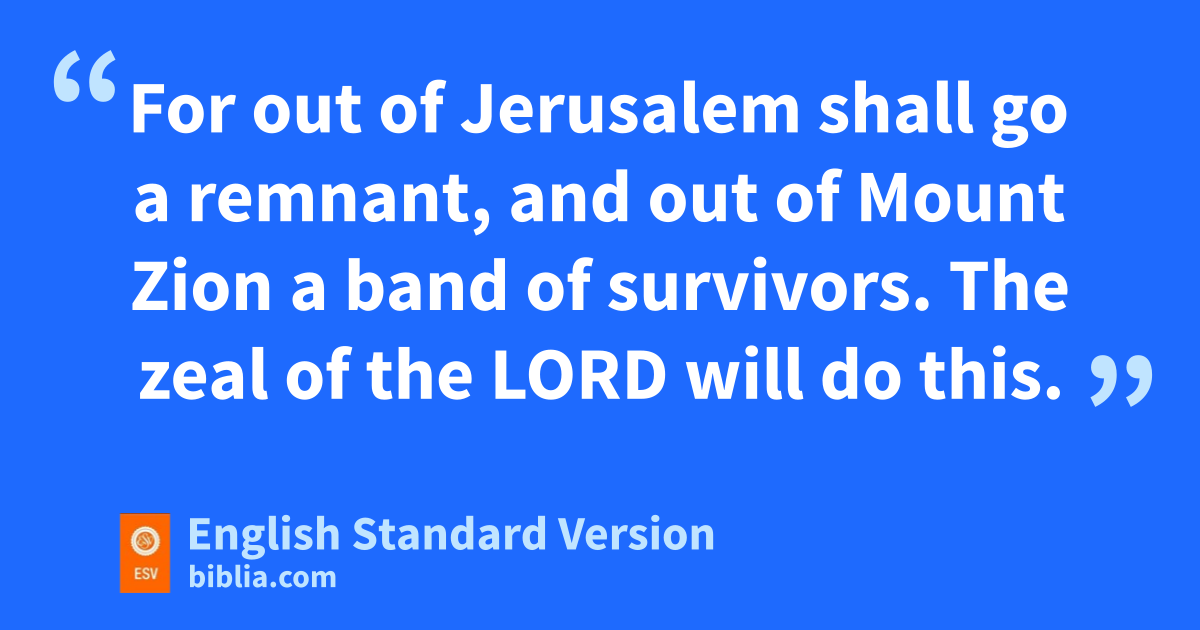 29 “And this shall be mthe sign for you: this year eat what grows of itself, and in the second year what springs of the same. Then in the third year sow and reap and plant vineyards, and eat their fruit. 30 nAnd the surviving remnant of the house of Judah shall again take root downward and bear fruit upward. 31 For out of Jerusalem shall go a remnant, and out of Mount Zion oa band of survivors. pThe zeal of the Lord will do this.