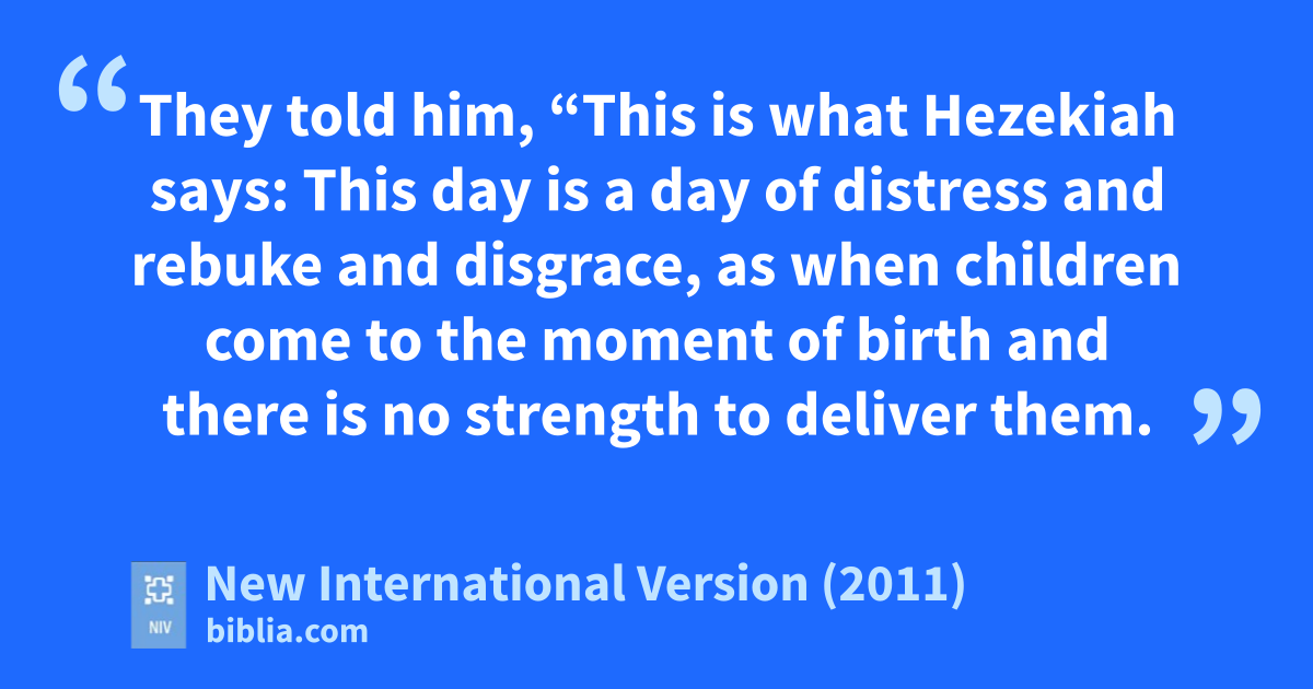 19 When King Hezekiah heard this, he torei his clothes and put on sackcloth and went into the temple of the Lord. 2 He sent Eliakimj the palace administrator, Shebna the secretary and the leading priests,k all wearing sackcloth,l to the prophet Isaiahm son of Amoz. 3 They told him, “This is what Hezekiah says: This day is a day of distress and rebuke and disgrace, as when children come to the momentn of birth and there is no strength to deliver them. 4 It may be that the Lord your God will hear all the words of the field commander, whom his master, the king of Assyria, has sent to ridiculeo the living God, and that he will rebukep him for the words the Lord your God has heard. Therefore pray for the remnantq that still survives.”