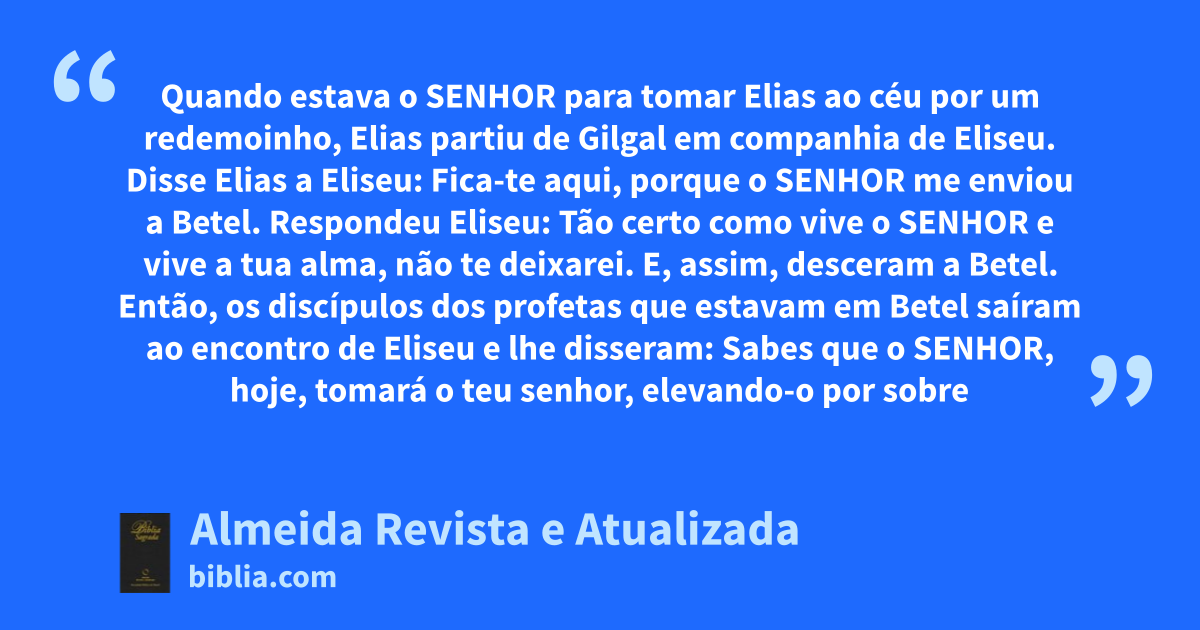 2 1 Quando estava o Senhor para tomar Elias ao céu por um redemoinho, Elias partiu de Gilgal em companhia de Eliseu. 2 Disse Elias a Eliseu: Fica-te aqui, porque o Senhor me enviou a Betel. Respondeu Eliseu: Tão certo como vive o Senhor e vive a tua alma, não te deixarei. E, assim, desceram a Betel. 3 Então, os discípulos dos profetas que estavam em Betel saíram ao encontro de Eliseu e lhe disseram: Sabes que o Senhor, hoje, tomará o teu senhor, elevando-o por sobre a tua cabeça? Respondeu ele: Também eu o sei; calai-vos.