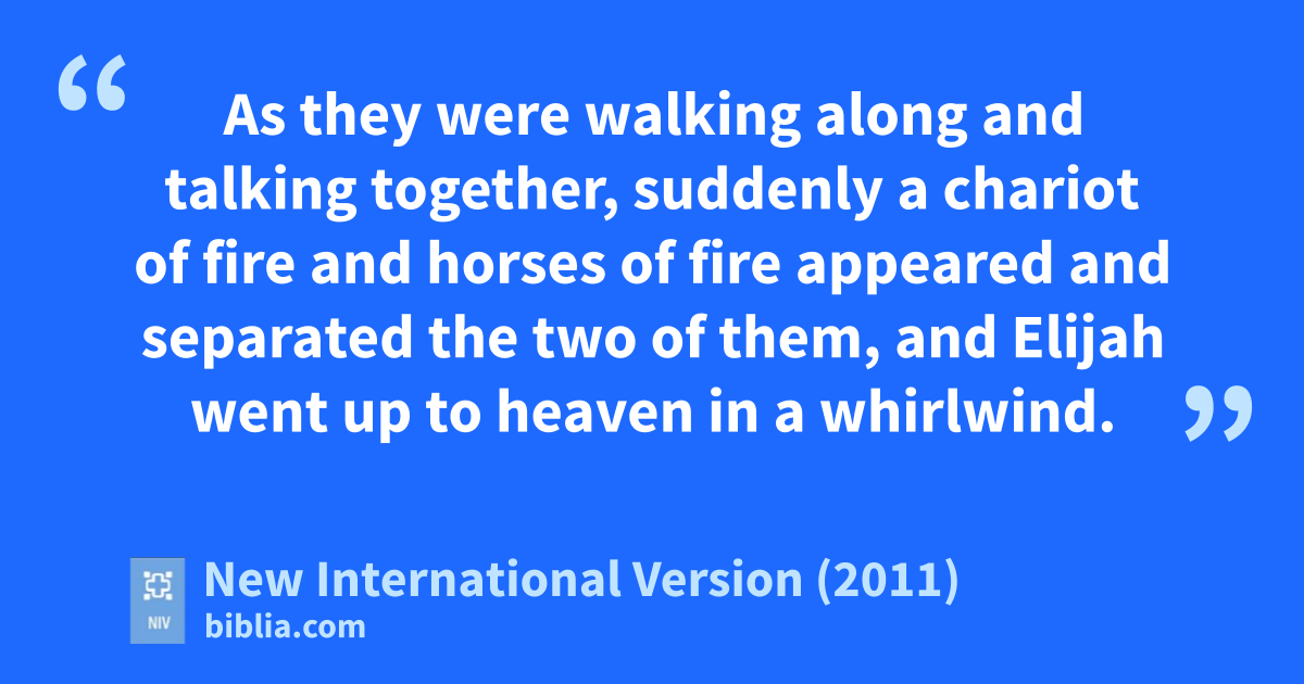 11 As they were walking along and talking together, suddenly a chariot of firen and horses of fire appeared and separated the two of them, and Elijah went up to heaveno in a whirlwind.p 12 Elisha saw this and cried out, “My father! My father! The chariotsq and horsemen of Israel!” And Elisha saw him no more. Then he took hold of his garment and torer it in two.