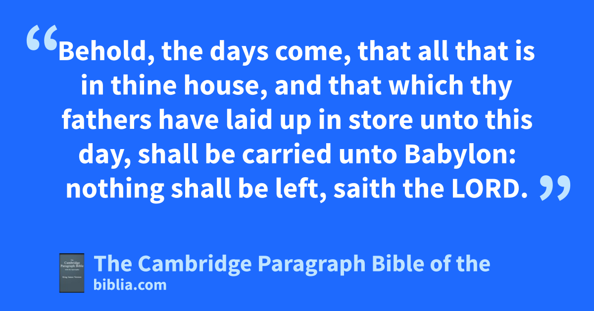 12 * rAt that time * Berodach-baladan, the son of Baladan, king of Babylon, sent letters and a present unto Hezekiah: for he had heard that Hezekiah had been sick. 13 And Hezekiah shearkened unto them, and shewed them all the house of his * precious things, the silver, and the gold, and the spices, and the precious ointment, and all the house of his * armour, and all that was found in his treasures: there was nothing in his house, nor in all his dominion, that Hezekiah shewed them not. 14 Then came Isaiah the prophet unto king Hezekiah, and said unto him, What said these men? and from whence came they unto thee? And Hezekiah said, They are come from a far country, even from Babylon. 15 And he said, What have they seen in thine house? And Hezekiah answered, tAll the things that are in mine house have they seen: there is nothing among my treasures that I have not shewed them. 16 And Isaiah said unto Hezekiah, Hear the word of the Lord. 17 Behold, the days come, that all that is in thine house, and that which thy fathers have laid up in store unto this day, ushall be carried unto Babylon: nothing shall be left, saith the Lord. 18 And of thy sons that shall issue from thee, which thou shalt beget, xshall they take away; * and they shall be eunuchs in the palace of the king of Babylon. 19 Then said Hezekiah unto Isaiah, yGood is the word of the Lord which thou hast spoken. And he said, * * Is it not good, if peace and truth be in my days? 20 zAnd the rest of the acts of Hezekiah, and all his might, and how he amade a pool, and a conduit, and bbrought water into the city, are they not written in the book of the chronicles of the kings of Judah? 21 And c* Hezekiah slept with his fathers: and Manasseh his son reigned in his stead.