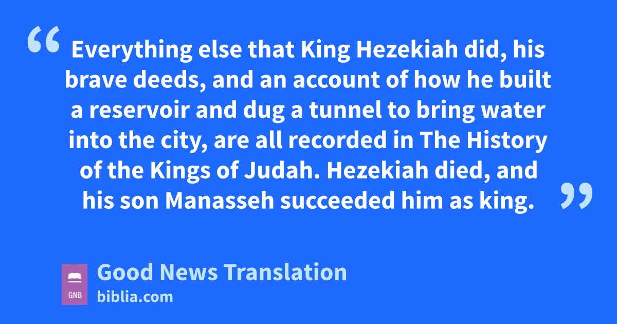20 Everything else that King Hezekiah did, his brave deeds, and an account of how he built a reservoir and dug a tunnel to bring water into the city, are all recorded in The History of the Kings of Judah. 21Hezekiah died, and his son Manasseh succeeded him as king.