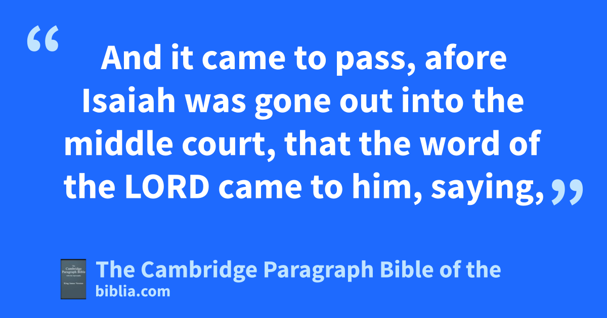 XX. * In athose days was Hezekiah sick unto death. And the prophet Isaiah the son of Amoz came to him, and said unto him, Thus saith the Lord, * Set thine house in order; for thou shalt die, and not live. 2 Then he turned his face bto the wall, and prayed unto the Lord, saying, 3 I beseech thee, O Lord, cremember now how I have walked before thee in truth and with da perfect heart, and ehave done that which is good in thy sight. And Hezekiah fwept * sore. 4 And it came to pass, afore Isaiah was gone out into the middle * court, that the word of the Lord came to him, saying, 5 Turn again, and tell Hezekiah gthe captain of my people, Thus saith the Lord, the God of David thy father, hI have heard thy prayer, I have seen ithy tears: behold, I will heal thee: on the third day thou shalt go up unto the house of the Lord. 6 And I will add unto thy days fifteen years; and I will deliver thee and this city out of the hand of the king of Assyria; and kI will defend this city for mine own sake, and for my servant David’s sake. 7 And lIsaiah said, Take a lump of figs. And they took and laid it on mthe boil, and he recovered. 8 And Hezekiah said unto Isaiah, nWhat shall be the sign that the Lord will heal me, and that I shall go up into the house of the Lord the third day? 9 And Isaiah said, This sign shalt thou have of the Lord, that the Lord will do the thing that he hath spoken: oshall the shadow go forward ten degrees, or go back ten degrees? 10 And Hezekiah answered, pIt is a light thing for qthe shadow to go down ten degrees: nay, but let the shadow return backward ten degrees. 11 And Isaiah the prophet cried unto the Lord: and he brought the shadow ten degrees backward, by which it had gone down in the * dial of Ahaz.