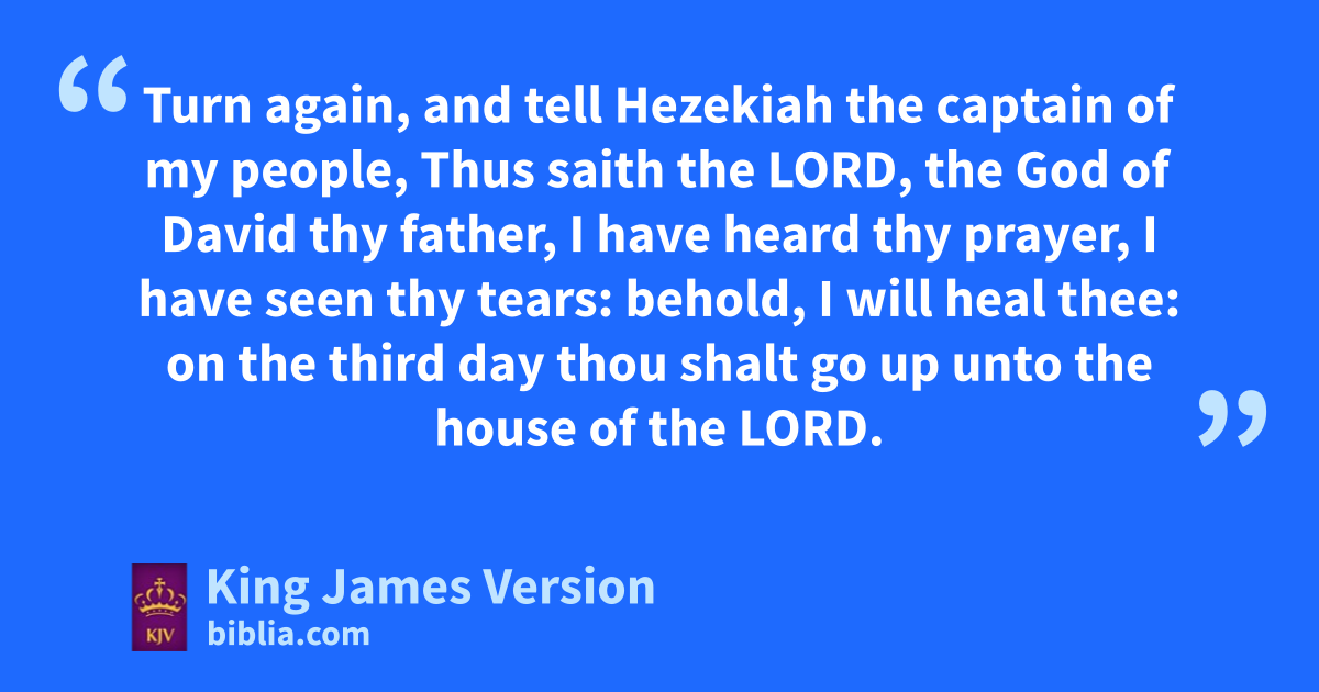 20 *In athose days was Hezekiah sick unto death. And the prophet Isaiah the son of Amoz came to him, and said unto him, Thus saith the Lord, †Set thine house in order; for thou shalt die, and not live. 2 Then he turned his face bto the wall, and prayed unto the Lord, saying, 3 I beseech thee, O Lord, cremember now how I have walked before thee in truth and with da perfect heart, and ehave done that which is good in thy sight. And Hezekiah fwept †sore. 4 And it came to pass, afore Isaiah was gone out into the middle ||court, that the word of the Lord came to him, saying, 5 Turn again, and tell Hezekiah gthe captain of my people, Thus saith the Lord, the God of David thy father, hI have heard thy prayer, I have seen ithy tears: behold, I will heal thee: on the third day thou shalt go up unto the house of the Lord. 6 And I will add unto thy days fifteen years; and I will deliver thee and this city out of the hand of the king of Assyria; and kI will defend this city for mine own sake, and for my servant David’s sake. 7 And lIsaiah said, Take a lump of figs. And they took and laid it on mthe boil, and he recovered. 8 And Hezekiah said unto Isaiah, nWhat shall be the sign that the Lord will heal me, and that I shall go up into the house of the Lord the third day? 9 And Isaiah said, This sign shalt thou have of the Lord, that the Lord will do the thing that he hath spoken: oshall the shadow go forward ten degrees, or go back ten degrees? 10 And Hezekiah answered, pIt is a light thing for qthe shadow to go down ten degrees: nay, but let the shadow return backward ten degrees. 11 And Isaiah the prophet cried unto the Lord: and he brought the shadow ten degrees backward, by which it had gone down in the †dial of Ahaz.