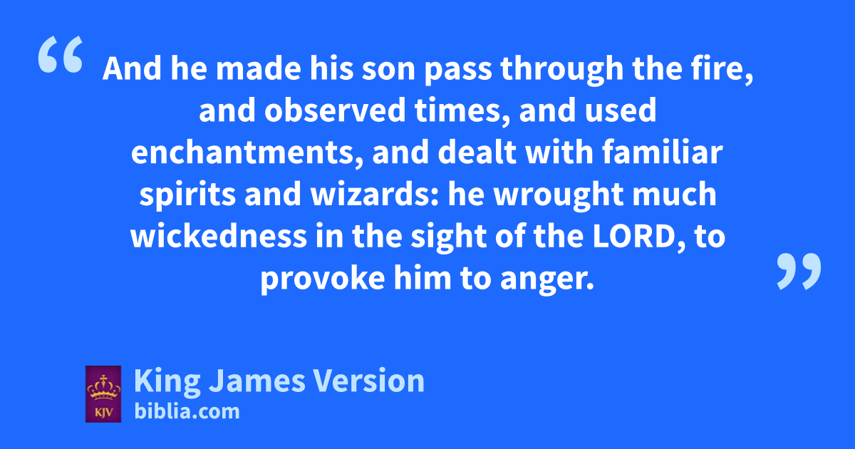 21 Manasseh awas twelve years old when he began to reign, and reigned fifty and five years in Jerusalem. And his mother’s name was Hephzi-bah. 2 And he did that which was evil in the sight of the Lord, bafter the abominations of the heathen, whom the Lord cast out before the children of Israel. 3 For he built up again the high places cwhich Hezekiah his father had destroyed; and he reared up altars for Baal, and made a grove, das did Ahab king of Israel; and worshipped eall the host of heaven, and served them. 4 And fhe built altars in the house of the Lord, of which the Lord said, gIn Jerusalem will I put my name. 5 And he built altars for eall the host of heaven in hthe two courts of the house of the Lord. 6 And ihe made his son pass through the fire, and jobserved times, and kused enchantments, and dealt with lfamiliar spirits and wizards: he wrought much wickedness in the sight of the Lord, to mprovoke him to anger. 7 And he set a graven image of the grove that he had made in the house, of which the Lord said to David, and to Solomon his son, nIn this house, and in Jerusalem, which I have chosen out of all tribes of Israel, will I put my name for ever: 8 oNeither will I make the feet of Israel move any more out of the land which I gave their fathers; only if they will observe to do according to all that I have commanded them, and according to all the law that my servant Moses commanded them. 9 But they hearkened not: and Manasseh seduced them to do more evil than did the nations whom the Lord destroyed before the children of Israel.