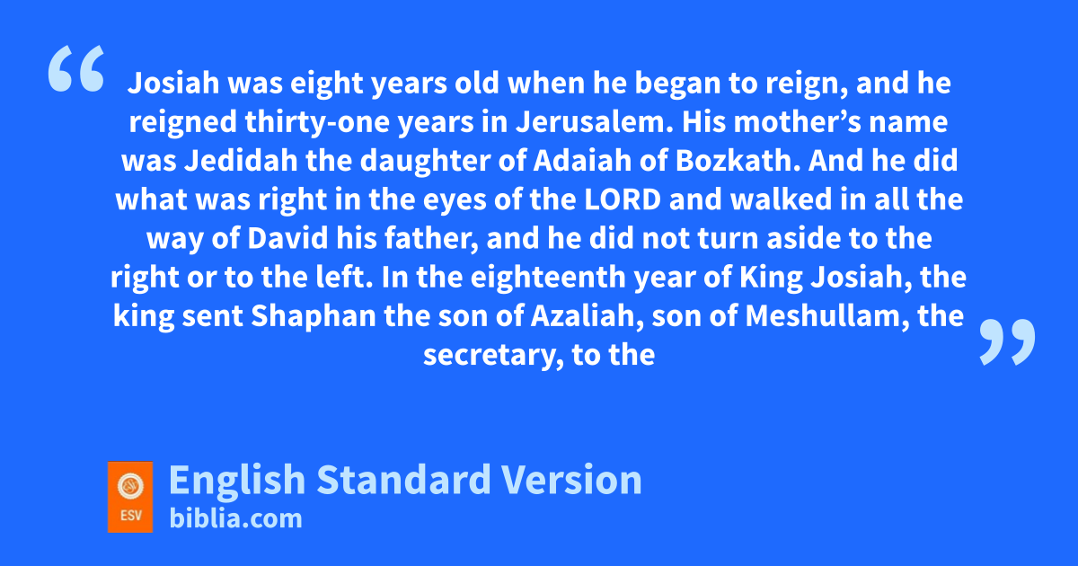 22 aJosiah was eight years old when he began to reign, and he reigned thirty-one years in Jerusalem. His mother’s name was Jedidah the daughter of Adaiah of bBozkath. 2 And he did what was right in the eyes of the Lord and walked in all the way of David his father, cand he did not turn aside to the right or to the left.