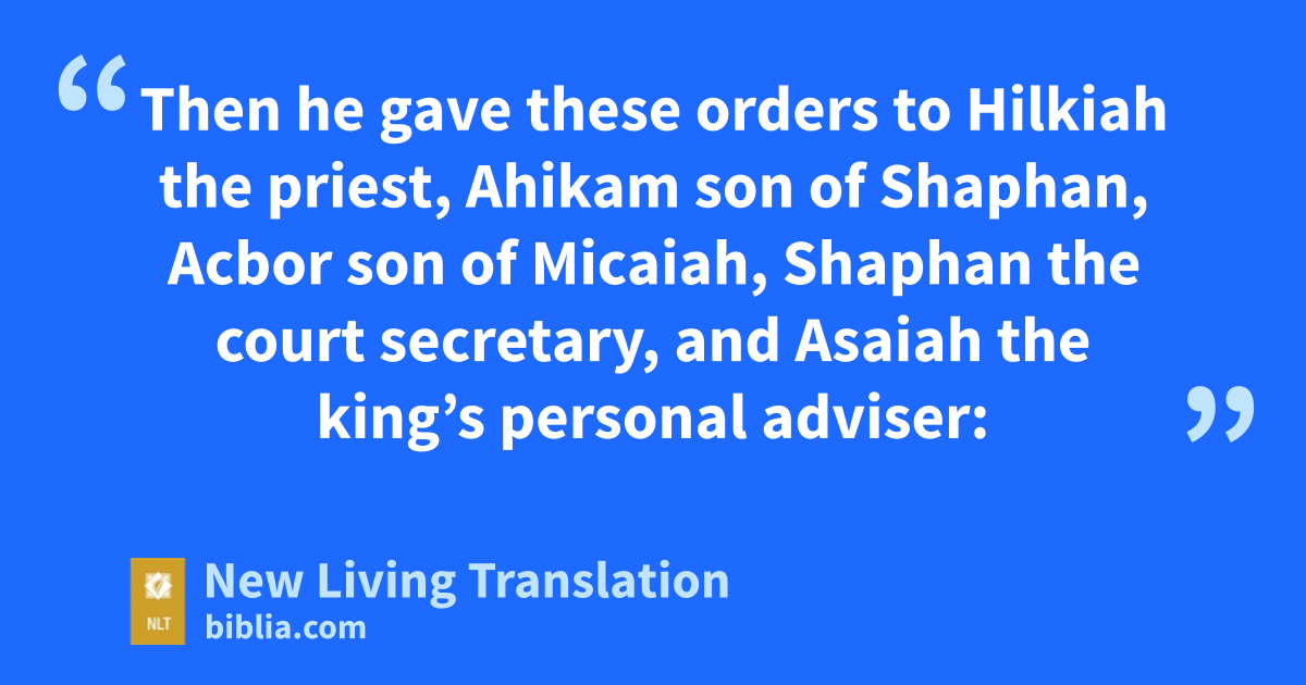 11 When the king heard what was written in the Book of the Law, he tore his clothes in despair. 12 Then he gave these orders to Hilkiah the priest, Ahikam son of Shaphan, Acbor son of Micaiah, Shaphan the court secretary, and Asaiah the king’s personal adviser: 13 “Go to the Temple and speak to the Lord for me and for the people and for all Judah. Inquire about the words written in this scroll that has been found. For the Lord’s great anger is burning against us because our ancestors have not obeyed the words in this scroll. We have not been doing everything it says we must do.”