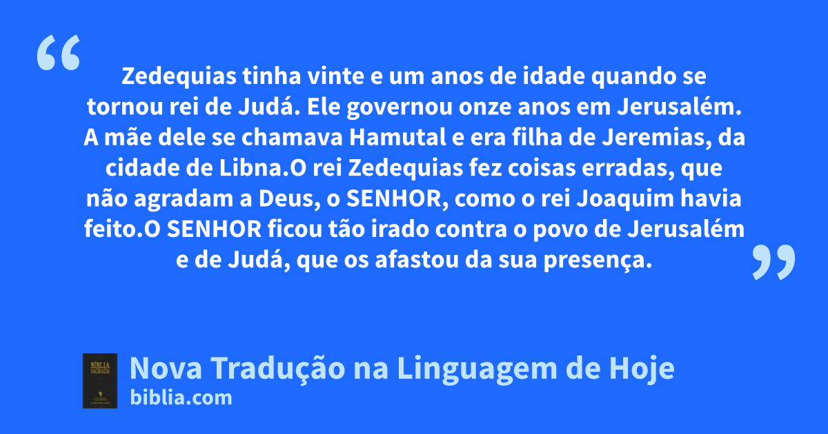 18 Zedequias tinha vinte e um anos de idade quando se tornou rei de Judá. Ele governou onze anos em Jerusalém. A mãe dele se chamava Hamutal e era filha de Jeremias, da cidade de Libna.6019 O rei Zedequias fez coisas erradas, que não agradam a Deus, o Senhor, como o rei Joaquim havia feito.20 O Senhor ficou tão * irado contra o povo de Jerusalém e de Judá, que os afastou da sua presença.61