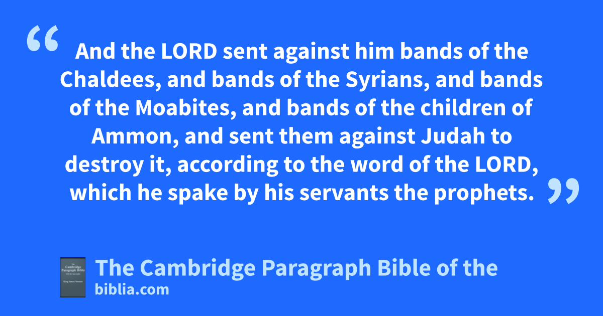 XXIV. In ahis days Nebuchadnezzar king of Babylon came up, and Jehoiakim became his servant bthree years: then he turned and rebelled against him. 2 * cAnd the Lord sent against him dbands of the Chaldees, and debands of the Syrians, and efbands of the Moabites, and bands of gthe children of Ammon, and sent them against Judah to destroy it, haccording to the word of the Lord, which he spake * by his servants the prophets. 3 Surely at the commandment of the Lord came this upon Judah, to remove them out of his sight, ifor the sins of Manasseh, according to all that he did; 4 and also for jthe innocent blood that he shed: for he filled Jerusalem with innocent blood; which the Lord would not pardon. 5 k* Now the rest of the acts of Jehoiakim, and all that he did, are they not written in the book of the chronicles of the kings of Judah? 6 So Jehoiakim lslept with his fathers: and Jehoiachin his son reigned in his stead. 7 And the king of Egypt came not again any more out of his land: for mthe king of Babylon had taken from the nriver of Egypt unto the river Euphrates all that pertained to the king of Egypt.