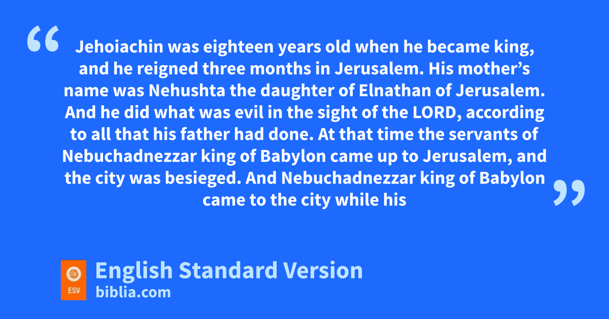 8 vJehoiachin was weighteen years old when he became king, and he reigned three months in Jerusalem. His mother’s name was Nehushta the daughter of Elnathan of Jerusalem. 9 And he did what was evil in the sight of the Lord, xaccording to all that his father had done.