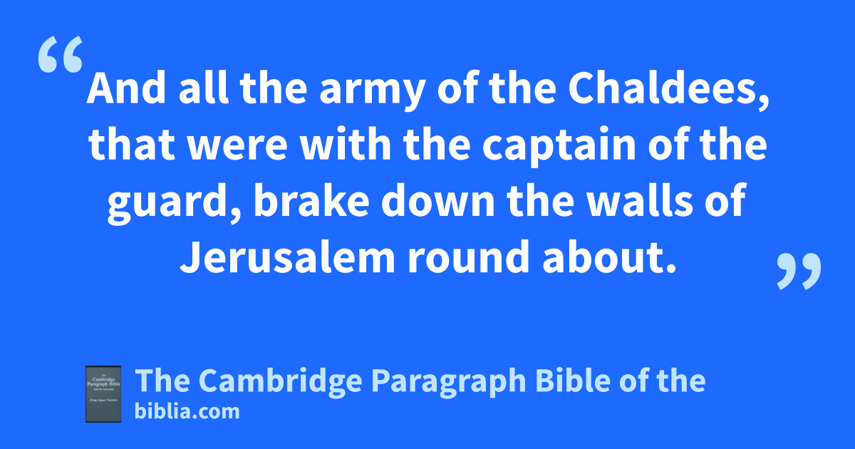 8 And in the pfifth month, on the qseventh day of the month, which is rthe nineteenth year of king Nebuchadnezzar king of Babylon, came Nebuzar-adan, * captain of the guard, a servant of the king of Babylon, unto Jerusalem: 9 and she burnt the house of the Lord, and the king’s house, and tall the houses of Jerusalem, and every great man’s house burnt he with fire. 10 And all the army of the Chaldees, that were uwith the captain of the guard, wbrake down the walls of Jerusalem round about. 11 Now xthe rest of the people that were left in the city, and the * fugitives that fell away to the king of Babylon, with the remnant of the multitude, did Nebuzar-adan the captain of the guard carry away. 12 But the captain of the guard left yof the poor of the land to be vinedressers and husbandmen. 13 zAnd athe pillars of brass that were in the house of the Lord, and bthe bases, and cthe brasen sea that was in the house of the Lord, did the Chaldees break in pieces, and carried the brass of them to Babylon. 14 And dthe pots, and dthe shovels, and ethe snuffers, and fthe spoons, and all the vessels of brass wherewith they ministered, took they away. 15 And dthe firepans, and dthe bowls, and such things as were of gold, in gold, and of silver, in silver, the captain of the guard took away. 16 gThe two pillars, * one sea, and hthe bases which Solomon had made for the house of the Lord; ithe brass of all these vessels was without weight. 17 kThe height of the one pillar was eighteen cubits, and the chapiter upon it was brass: and the height of the chapiter lthree cubits; and the wreathen work, and pomegranates upon the chapiter round about, all of brass: and like unto these had the second pillar with wreathen work. 18 And the captain of the guard took mSeraiah nthe chief priest, and oZephaniah pthe second priest, and the three keepers of the * door: 19 and out of the city he took an * officer that was set over the men of war, and qfive men of them that * were in the king’s presence, which were found in the city, and the * principal scribe of the host, which mustered the people of the land, and threescore men of the people of the land that were found in the city: 20 and Nebuzar-adan captain of the guard took these, and brought them to the king of Babylon to rRiblah: 21 and the king of Babylon smote them, and slew them at rRiblah in the land of Hamath. sSo Judah was carried away out of their land.