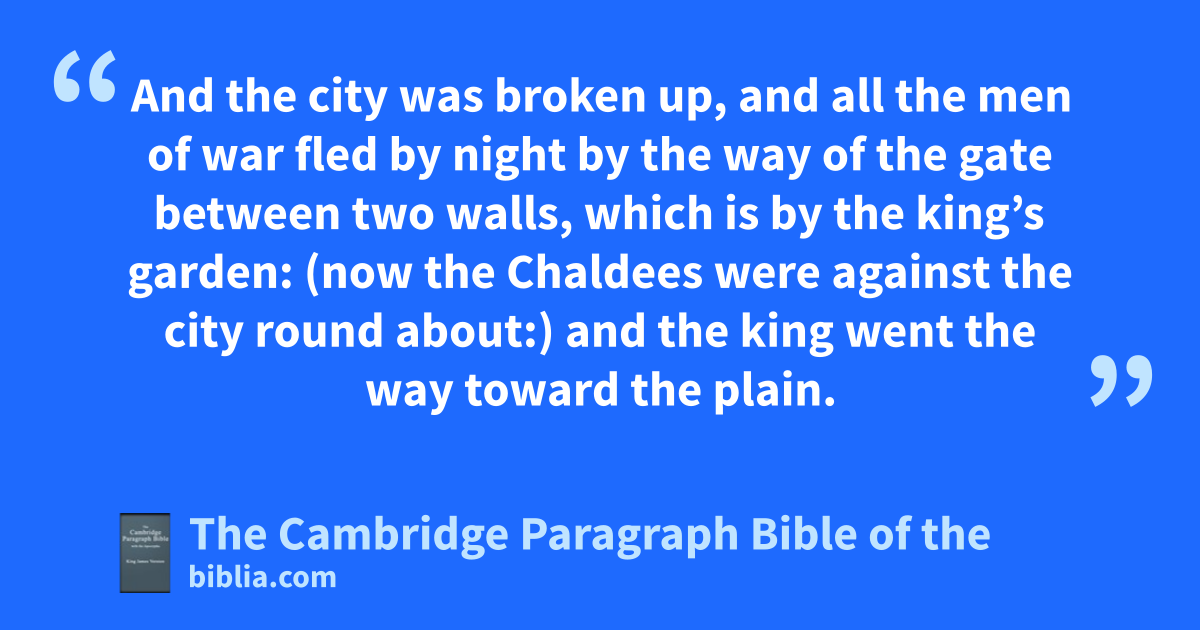 XXV. * And it came to pass ain the ninth year of his reign, in the btenth month, in the tenth day of the month, that Nebuchadnezzar king of Babylon came, he, and all his host, against Jerusalem, and pitched against it; and they built cforts against it round about. 2 * And the city was besieged unto the eleventh year of king Zedekiah. 3 And on the ninth day of the dfourth month ethe famine prevailed in the city, and there was no bread for the people of the land. 4 And ethe city was broken up, and fall the men of war gfled by night by the way of the gate between two walls, which is by hthe king’s garden: (now the iChaldees were against the city round about:) and jthe king went the way toward kthe plain. 5 And the army of the Chaldees pursued after the king, and overtook him in kthe plains of Jericho: and all his army were scattered from him. 6 So they took the king, and lbrought him up to the king of Babylon to mRiblah; and they * gave judgment upon him. 7 And they slew the sons of Zedekiah before his eyes, and * nput out the eyes of Zedekiah, and obound him with fetters of brass, and carried him to Babylon.