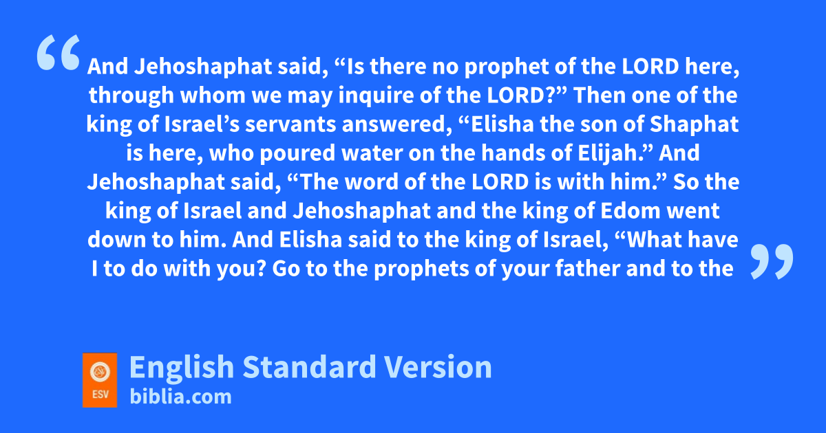 9 So the king of Israel went with the king of Judah and nthe king of Edom. And when they had made a circuitous march of seven days, there was no water for the army or for the animals that followed them. 10 Then the king of Israel said, “Alas! oThe Lord has called these three kings to give them into the hand of Moab.” 11 pAnd Jehoshaphat said, “Is there no prophet of the Lord here, through whom we may inquire of the Lord?” Then one of the king of Israel’s servants answered, q“Elisha the son of Shaphat is here, rwho poured water on the hands of Elijah.” 12 And Jehoshaphat said, “The word of the Lord is with him.” So the king of Israel and Jehoshaphat and the king of Edom went down to him.
