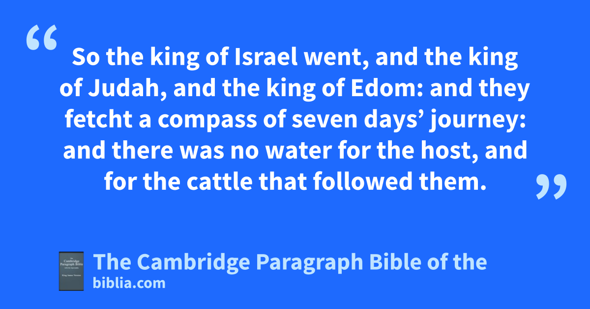 III. Now aJehoram the son of Ahab began to reign over Israel in Samaria the eighteenth year of Jehoshaphat king of Judah, and reigned twelve years. 2 * And he wrought evil in the sight of the Lord; but not like his father, and like his mother: for he put away the * image of Baal bthat his father had made. 3 Nevertheless he cleaved unto cthe sins of Jeroboam the son of Nebat, dwhich made Israel to sin; he departed not therefrom. 4 And Mesha king of Moab was a esheepmaster, and rendered unto the king of Israel an hundred thousand flambs, and an hundred thousand rams, with the wool. 5 But it came to pass, when gAhab was dead, that the king of Moab rebelled against the king of Israel. 6 And king Jehoram went out of Samaria the same time, and numbered all Israel. 7 * And he went and sent to Jehoshaphat the king of Judah, saying, The king of Moab hath rebelled against me: wilt thou go with me against Moab to battle? And he said, I will go up: iI am as thou art, my people as thy people, and my horses as thy horses. 8 And he said, Which way shall we go up? And he answered, The way through the wilderness of Edom. 9 So the king of Israel went, and the king of Judah, and kthe king of Edom: and they fetcht a compass of seven days’ journey: and there was no water for the host, and for the cattle that * followed them. 10 And the king of Israel said, lAlas, that the Lord hath called these three kings together, to deliver them into the hand of Moab. 11 But mJehoshaphat said, Is there not here a prophet of the Lord, that we may inquire of the Lord by him? And none of the king of Israel’s servants answered and said, Here is Elisha the son of Shaphat, owhich poured water on the hands of Elijah. 12 And Jehoshaphat said, The word of the Lord is with him. So the king of Israel and Jehoshaphat and the king of Edom went down to him. 13 And Elisha said unto the king of Israel, pWhat have I to do with thee? qget thee to the prophets of thy father, and to rthe prophets of thy mother. And the king of Israel said unto him, Nay: for the Lord hath called these three kings together, to deliver them into the hand of Moab. 14 And Elisha said, sAs the Lord of hosts liveth, before whom I stand, surely, were it not that I tregard the presence of Jehoshaphat the king of Judah, I would not look toward thee, nor see thee. 15 But now bring me ua minstrel. And it came to pass, when the minstrel played, that wthe hand of the Lord came upon him. 16 And he said, Thus saith the Lord, Make this valley full of xditches. 17 For thus saith the Lord, Ye shall not see wind, neither shall ye see rain; yet that valley shall be filled with water, that ye may drink, both ye, and your cattle, and your beasts. 18 And this is but ya light thing in the sight of the Lord: he will deliver the Moabites also into your hand. 19 And ye shall smite every fenced city, and every choice city, and shall fell every good tree, and stop all wells of water, and * mar every good piece of land with stones. 20 And it came to pass in the morning, when zthe meat offering was offered, that behold, there came water by the way of Edom, and the country was filled with water.