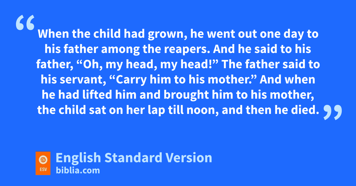 18 When the child had grown, he went out one day to his father among the reapers. 19 And he said to his father, “Oh, nmy head, my head!” The father said to his servant, “Carry him to his mother.” 20 And when he had lifted him and brought him to his mother, the child sat on her lap till noon, and then he died. 21 And she went up oand laid him on the bed of the gman of God and shut the door behind him and went out. 22 Then she called to her husband and said, “Send me one of the servants and one of the donkeys, that I may quickly go to gthe man of God and come back again.” 23 And he said, “Why will you go to him today? It is neither pnew moon nor Sabbath.” She said, “All is well.” 24 Then she saddled the donkey, and she said to her servant, “Urge the animal on; do not slacken the pace for me unless I tell you.” 25 So she set out and came to the man of God qat Mount Carmel.