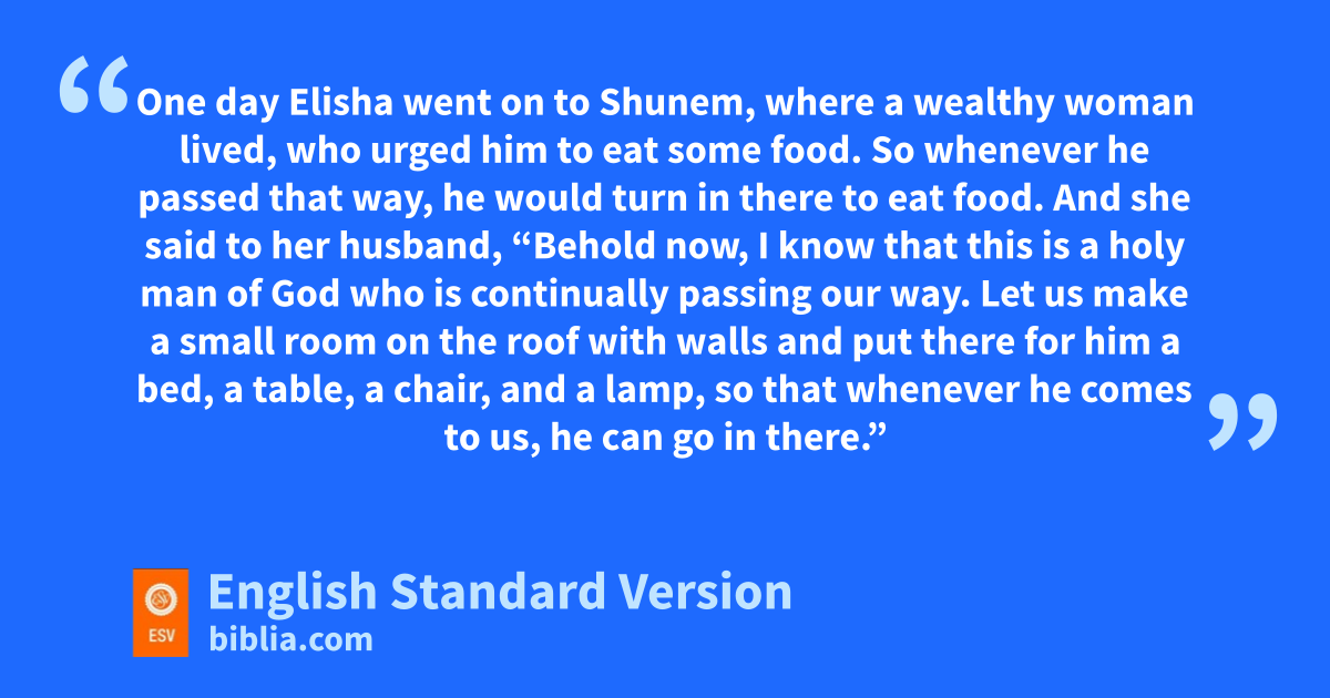 8 One day Elisha went on to hShunem, where a iwealthy woman lived, who urged him to eat some food. So whenever he passed that way, he would turn in there to eat food. 9 And she said to her husband, “Behold now, I know that this is a holy gman of God who is continually passing our way. 10 Let us make a small room on the roof with walls and put there for him a bed, a table, a chair, and a lamp, so that whenever he comes to us, he can go in there.”